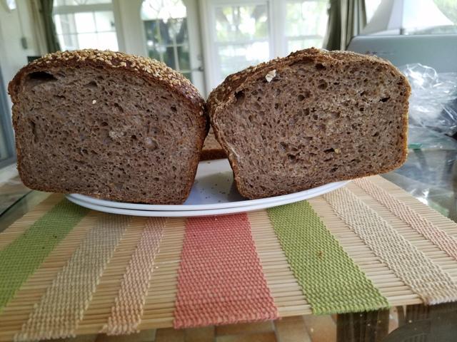Loaf on the right made with preferment. There is some bench flour in the middle of the crumb. After I panned, I had to remove it from the pan and re-pan. Being a very sticky, loose dough, it was difficult to do and I did re-shape after it picked up a good dose of bench flour. It did windowpane but it was more fragile than the usual. This dough was ready first for shaping, panning and proofed a little faster. It also looked ready to overproof any minute. The leaven in this loaf was 100% natural leaven.