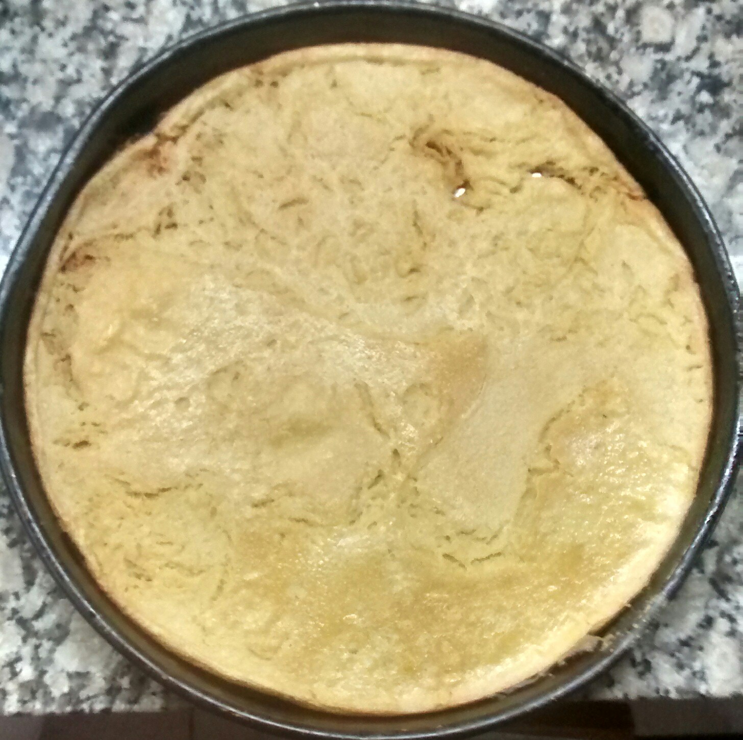 When the oven has reached the target temperature, drop the preparation into the hot pizza pan (I use a pitcher and fill the pan straight in the oven to avoid manipulate the pan + hot oil combo). Close the oven and cook 40 minutes.