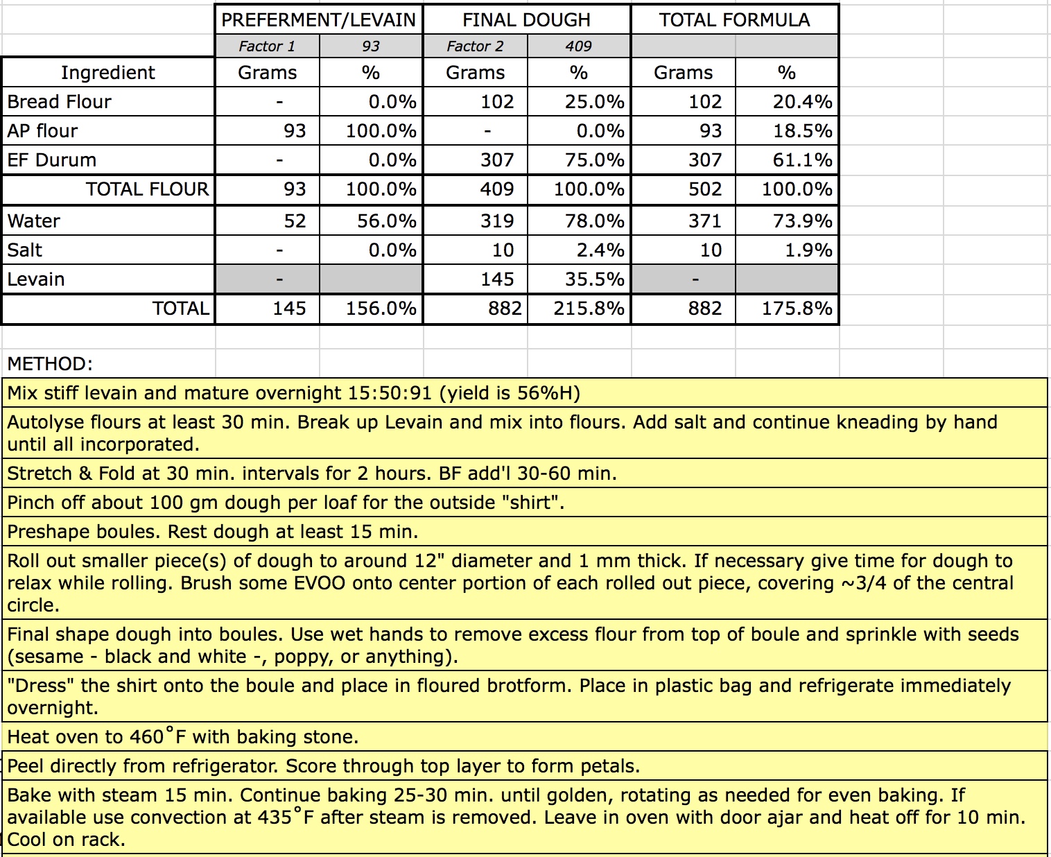 The bread was called Pane Incamiciato (bread in a shirt) and was posted by Valentinaa. I made the bread and wrote about it in this post. Unfortunately, the link on the page is now not working so the OP may have deleted it. I didn't post a formula, but I could look up my notes if you would like it. If I recall, it was a basic sourdough with about 30% Extra Fancy Durum flour and about 70-72% hydration. A piece of 100 grams was divided off and rolled out to a thin sheet, brushed with olive oil and placed around the boule previously sprinkled with seeds on the surface, and the loaf was then retarded overnight. When ready to bake, you score only through the top sheet and the oven spring forms the "petals" of the flower which get very cracker-like.