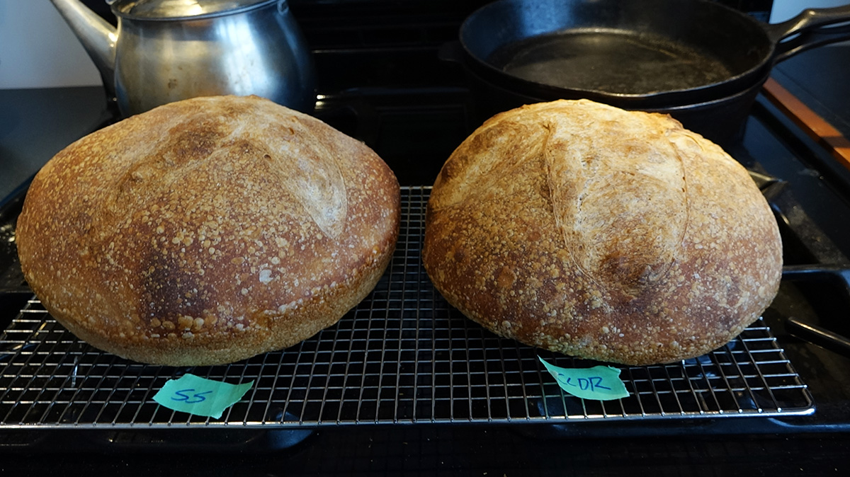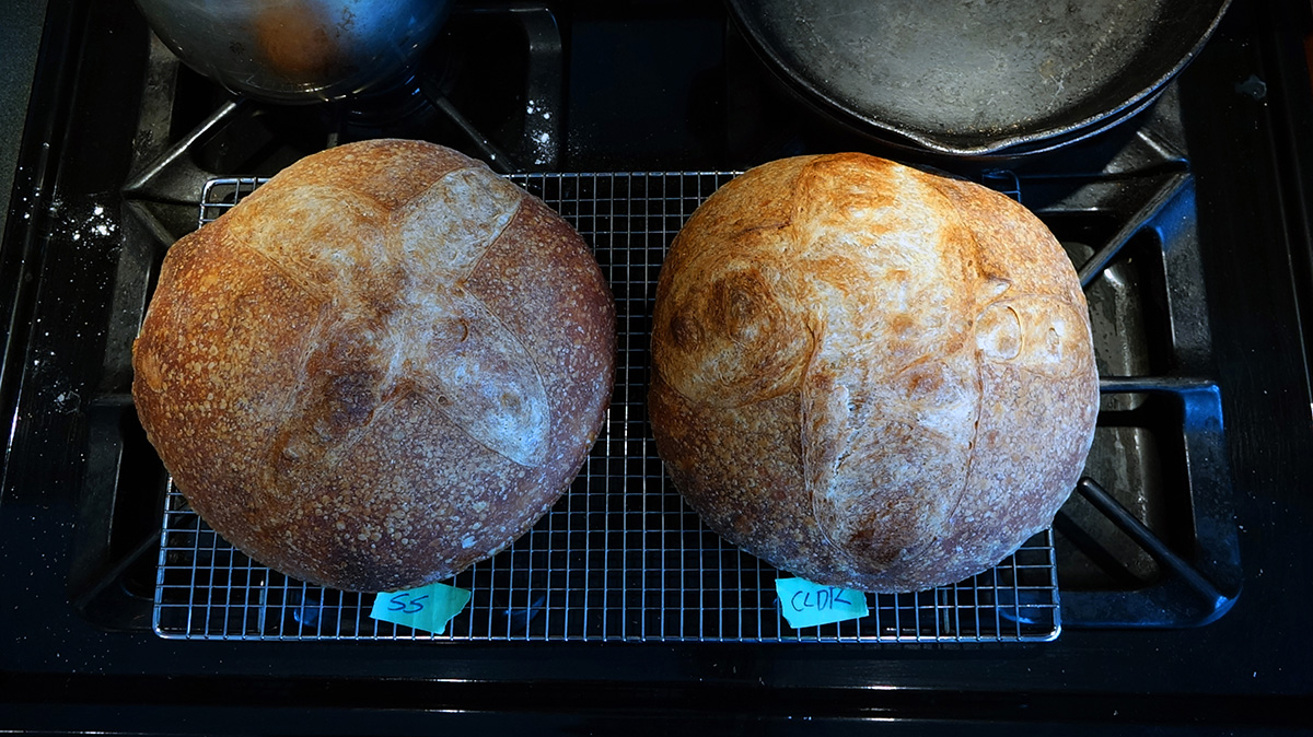 The loaves were baked identically, in cast iron pans covered with aluminum turkey pans for the first 20 minutes at 450.