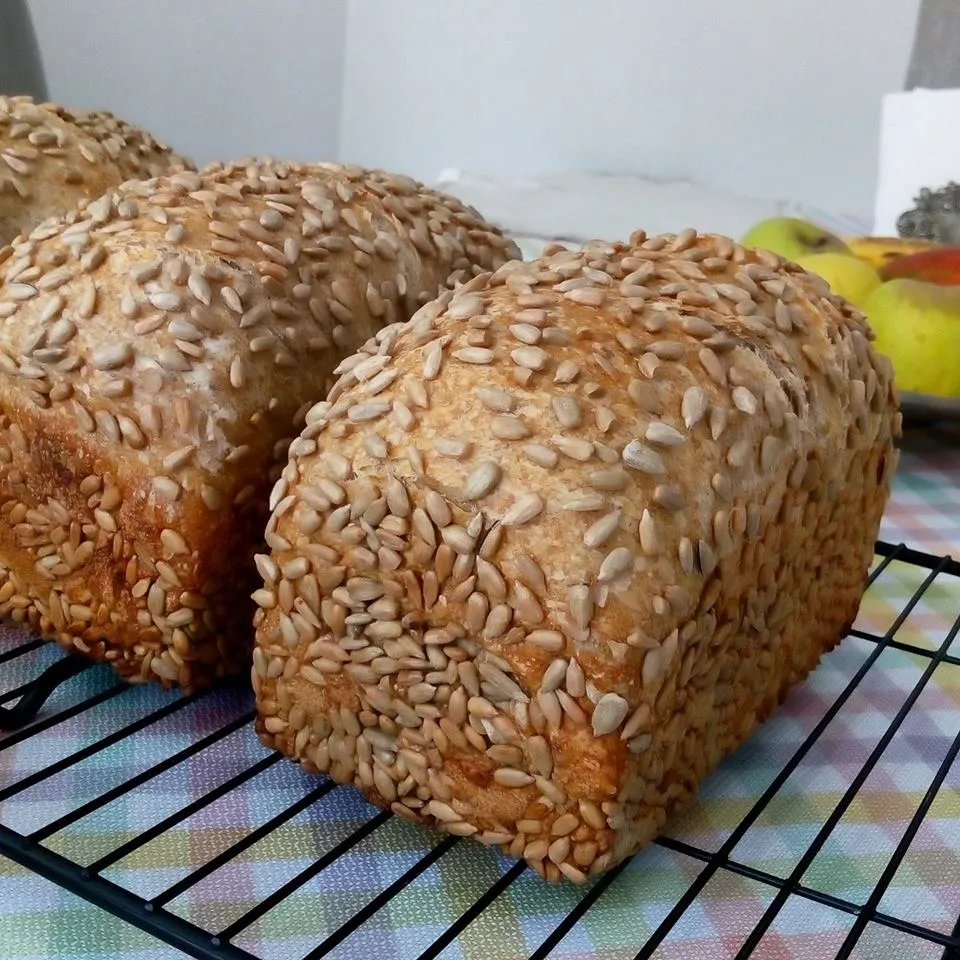 Two hours of bulk fermentation, with one fold in between. Divide and let relax 20 minutes. Shape. Wet the dough with moistened towel and make it roll over a tray with Sunflower Seeds. Put inside greased sandwich tins. Let ferment 30 minutes at room temperature, and then let it proof in the fridge overnight. Next day, let the dough temper 2 hours before baking.