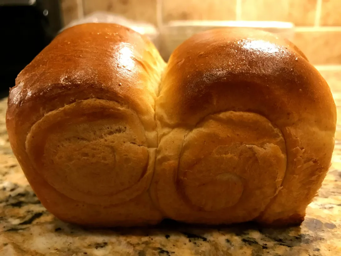 Basically, all I did was make the Tangzhong the night before and then mixed it all up in my KitchenAid and went to town on first proof, folding, second proof, dividing, preshaping, more proofing, rolling, shaping, panning, more proofing, preheating, egg washing, baking, rotating, baking, rotating, baking, cooling, decide I'm too impatient to wait, eat one while it's hot, go to be at 2am, get up at 5:30 am and play with the two sourdough I left to proof before bed. Ok time to get them in the oven, I hope they come out fine.