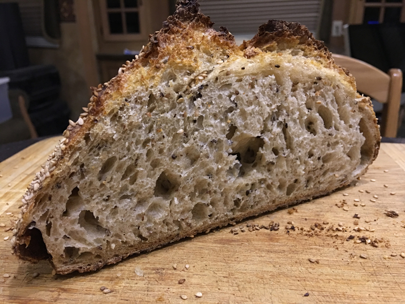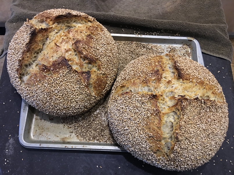 A few years ago, I managed with great difficulty to get a sourdough starter going, only to find out that I really didn't like sour bread. I let the starter die, and went back to yeasted bread. I recently retired, and just spent my first winter living in my RV in the US southwest, doing astrophotography. While in southern California a few months ago, I made another attempt at a sourdough starter, only to once again confirm that I do not like sour bread. Before tossing the starter, I came across the info that the sourness could be controlled or even eliminated. I was intrigued, and I eventually bought Tartine Bread by Chad Robertson, and it has changed the way I make bread forever. I mostly follow his Country Bread formula, but add a sesame seed crust and toasted sesame seeds in the dough as well. I also add 10% spelt flour for the nutty flavour. There is no sour flavour. Here is a pic of today's loaves.