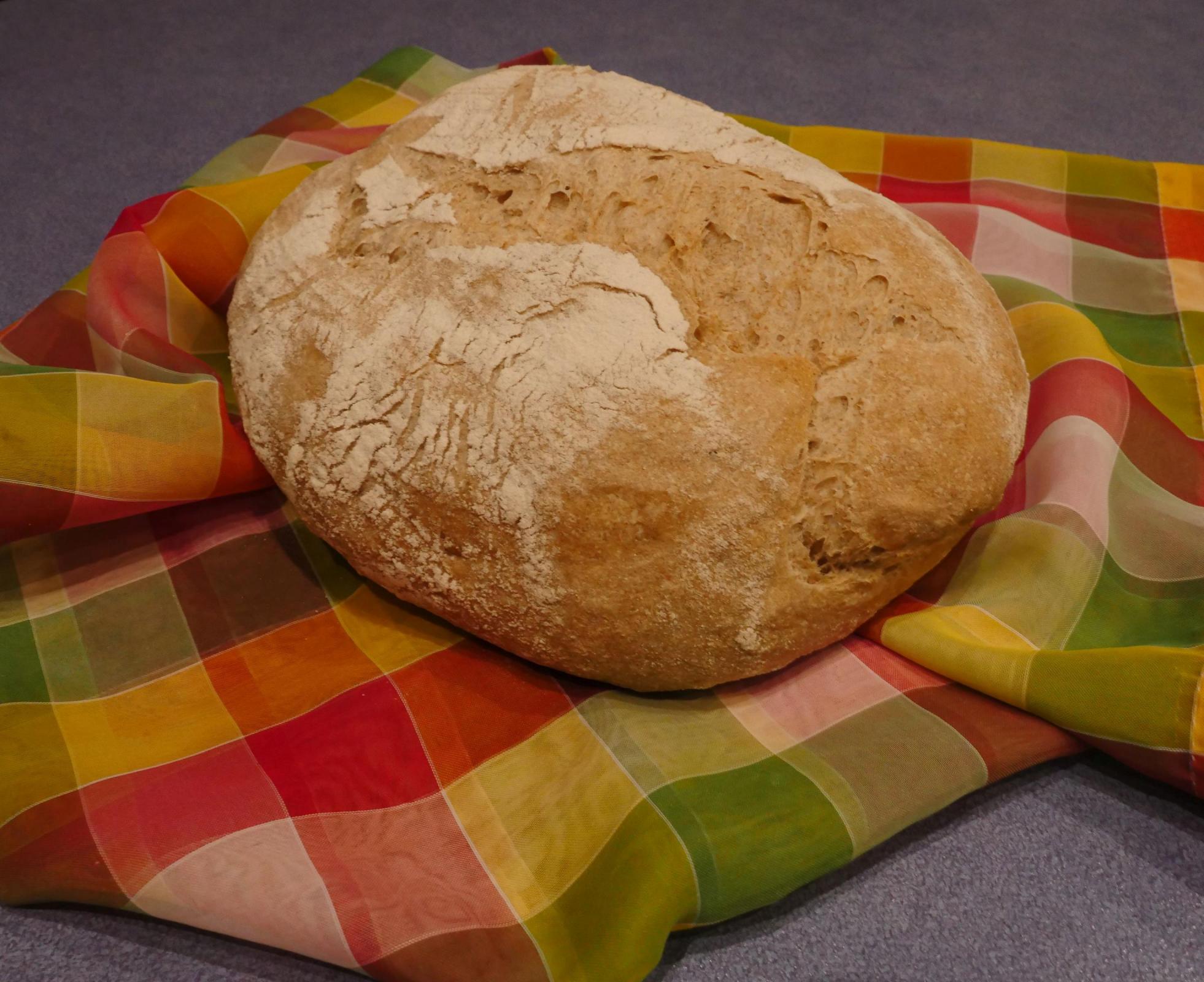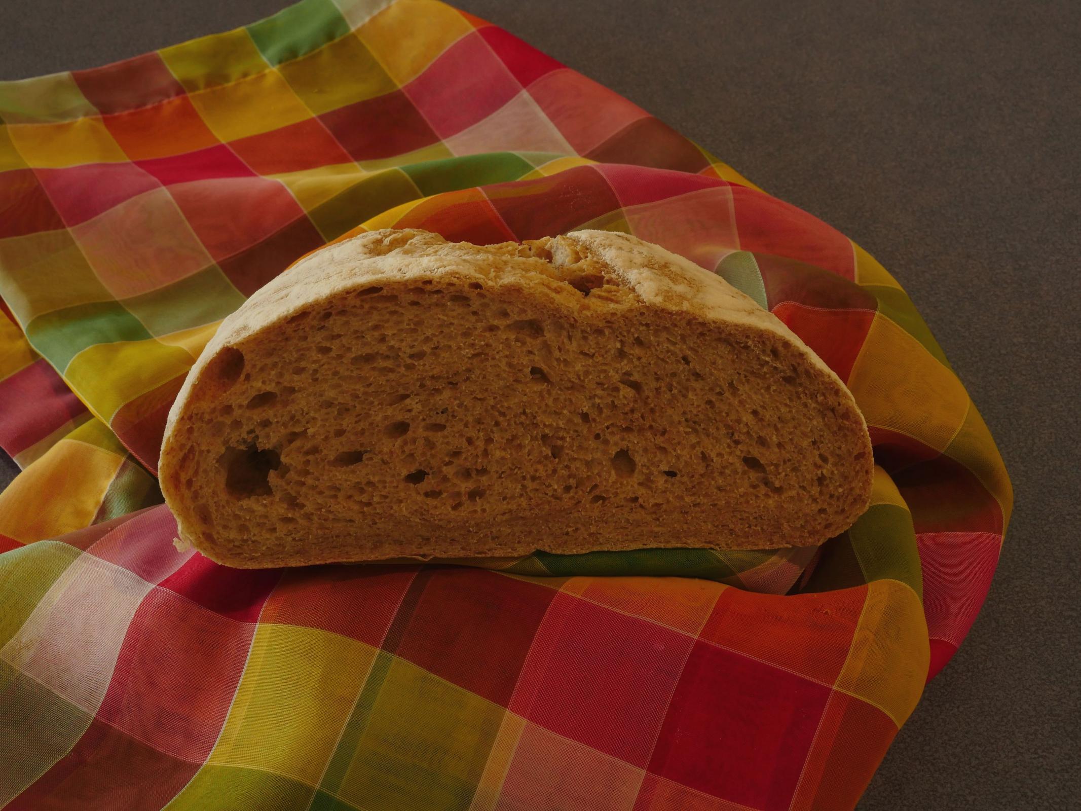 A fond adieu to Portugal with this light semolina loaf, pao Alentejo, from Nelson Carvalheiro's recipe. It starts off with two different starters, one made with bread flour and one with rye. Left them overnight to bubble and mixed the bread the next morning. I got busy in the garden, so it overproofed a bit. I gently knocked it down and shaped the loaf according to Berndt's method and let it rise in a bowl lined with well-floured cheesecloth. It all worked well except that I could not get the required ridge when it baked. I probably did not flour the end of the roll enough before putting it down to rise. It is one of the nicest tasting breads I have ever baked. I will make it again and keep on trying to get the right ride along the loaf.