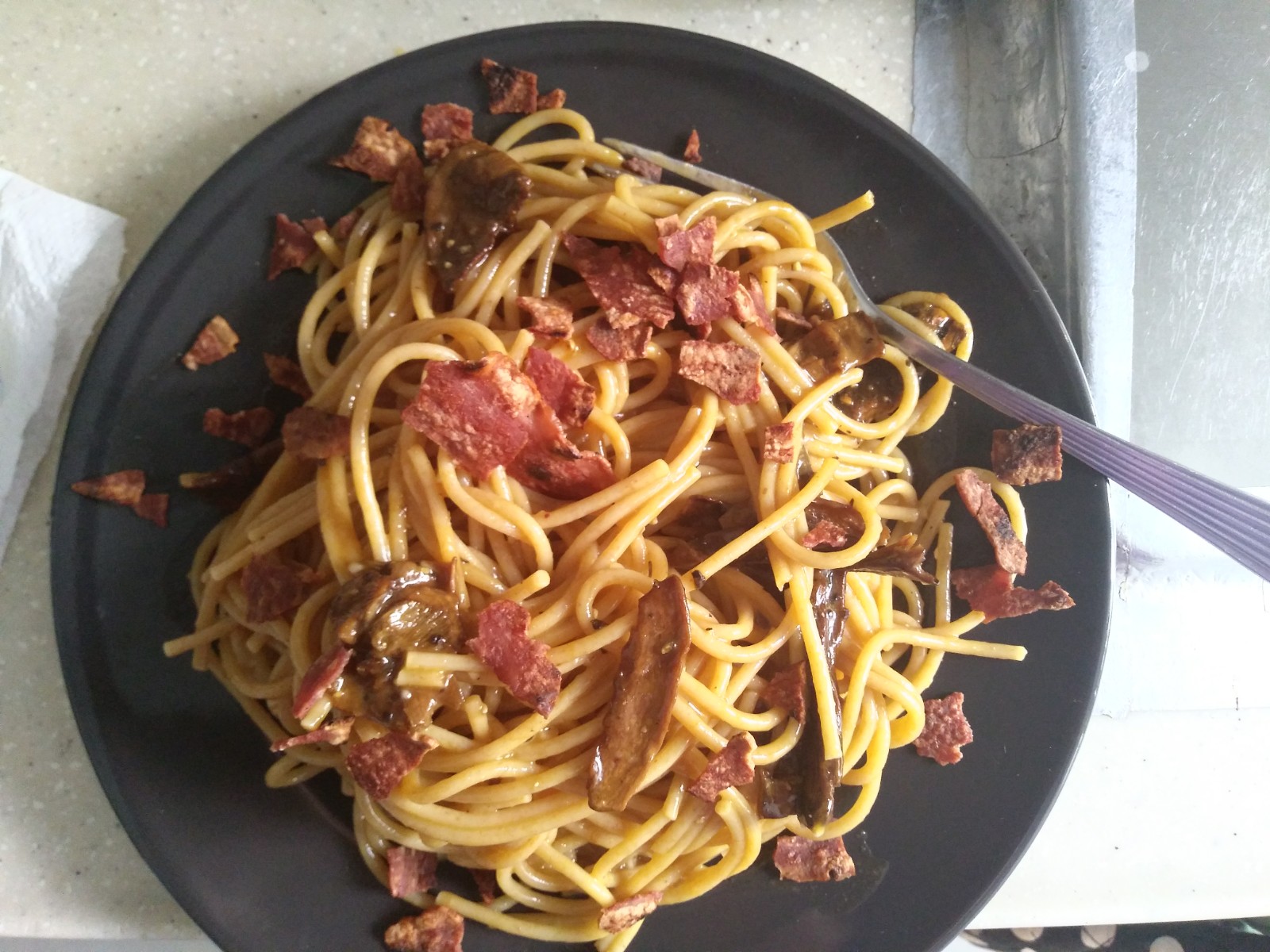 Lunch today: Spaghetti Carbonara with Pecorino Romano, Parmigiano-Reggiano, porcini mushroom (I'm not Italian so I don't have to follow the rules, right?), egg yolks, bacon, black peppers and whole wheat pasta (so that there needn't be any guilt at all)