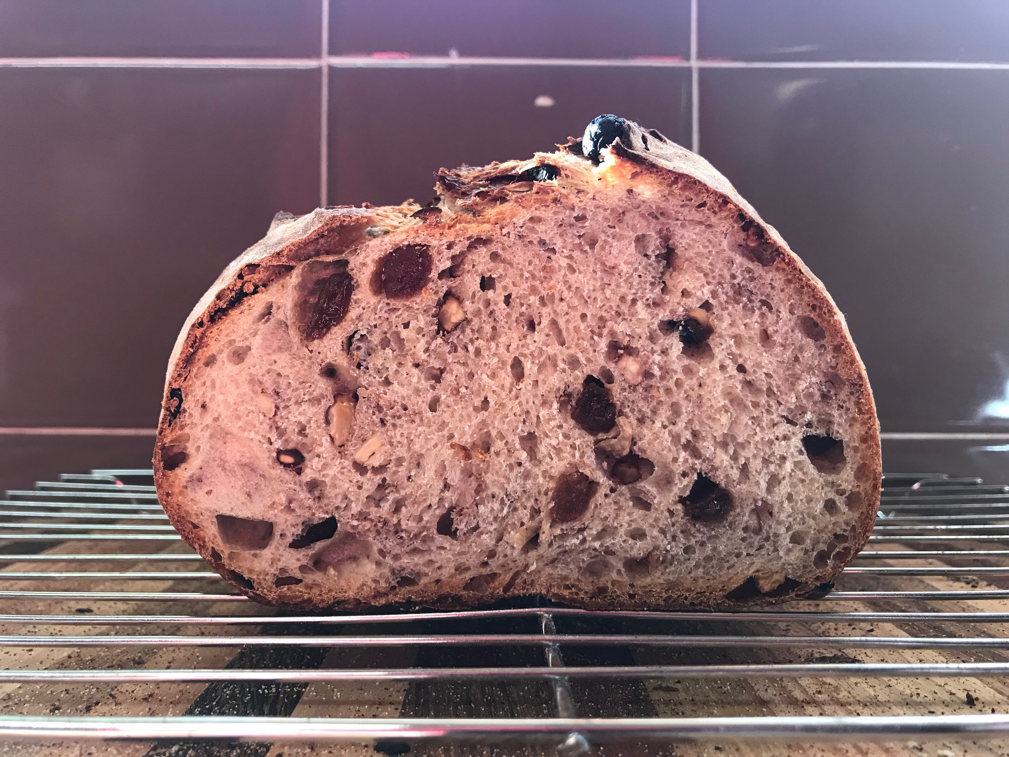 … bakes by Lechem and leslieruf presented a personal challenge, so midweek I retrieved my aging AYW from the depths of the fridge, fed it a fresh apple and tried my hand at Hamelman’s recipe this weekend.  These pictures tell half the story, and the second half will follow with a crumb shot tomorrow – my first slice will be a celebration of SA’s victory over England at rugby this evening!  At first blush the raisins look a bit sun burnt notwithstanding a bake at 230C with protective stainless steel lid for the first 15 minutes followed by the balance of time at 220C.