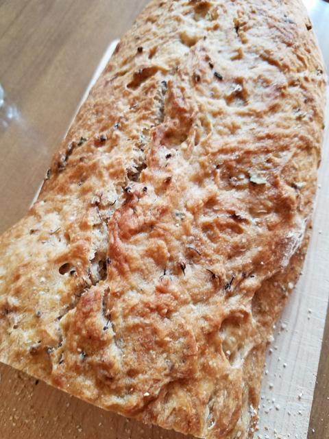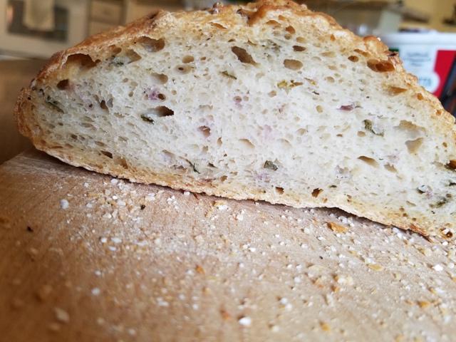 You can see the lovely lavender flowers in the crumb and the darker pieces of the chopped chive leaves.