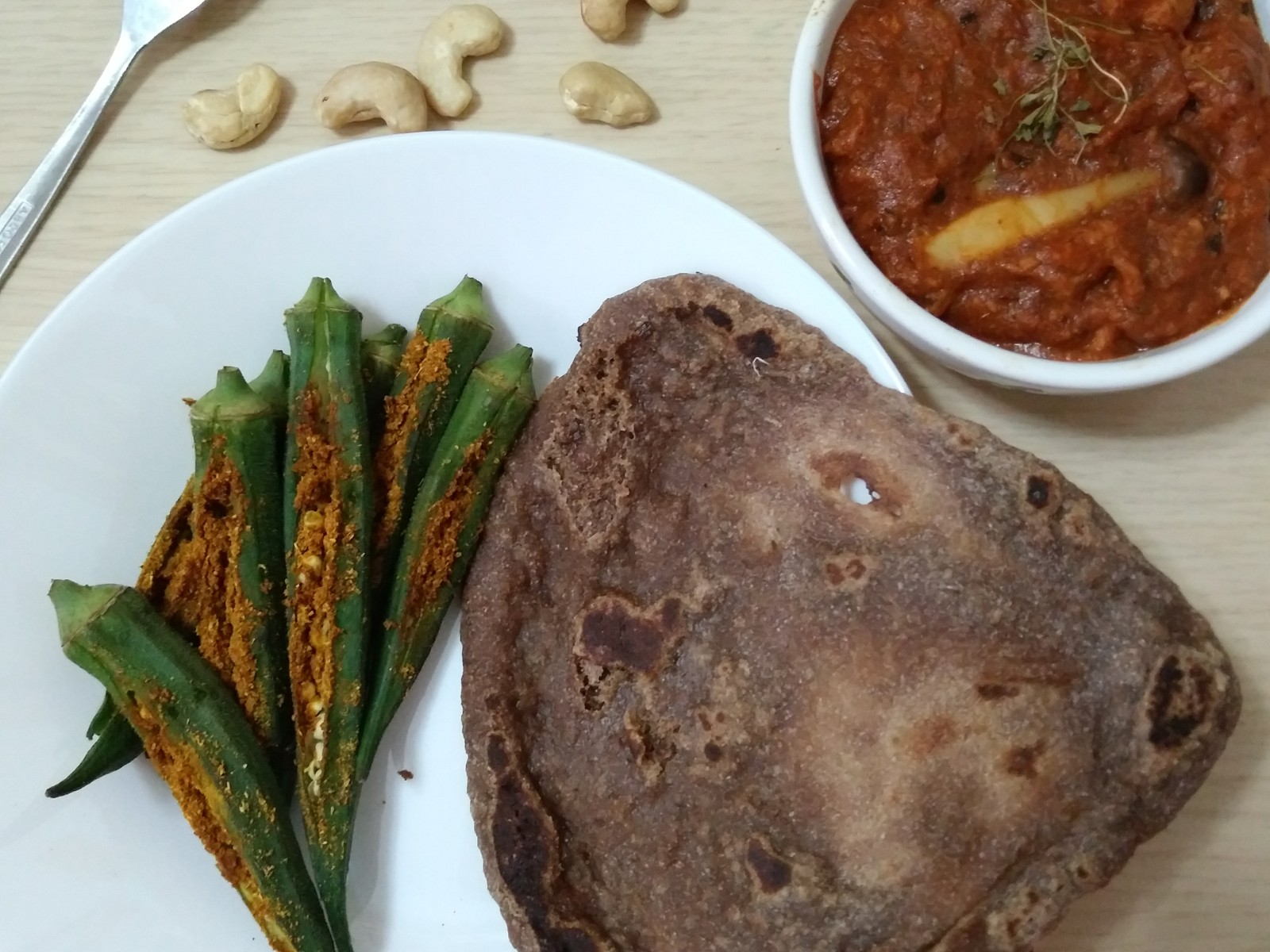 Whole spelt sourdough naan, spice stuffed okra, and mushroom and soya chunk in tomato cashew curry