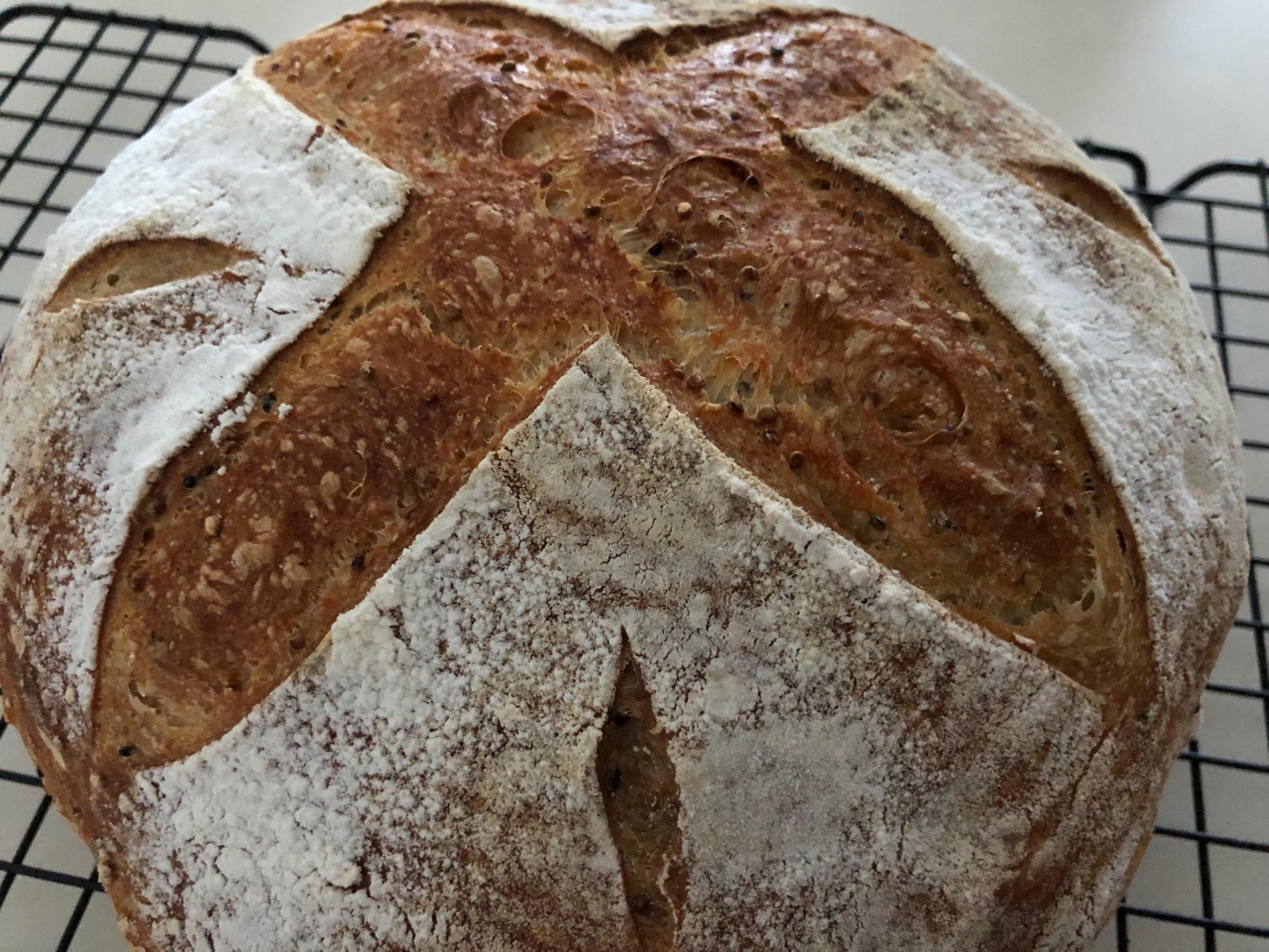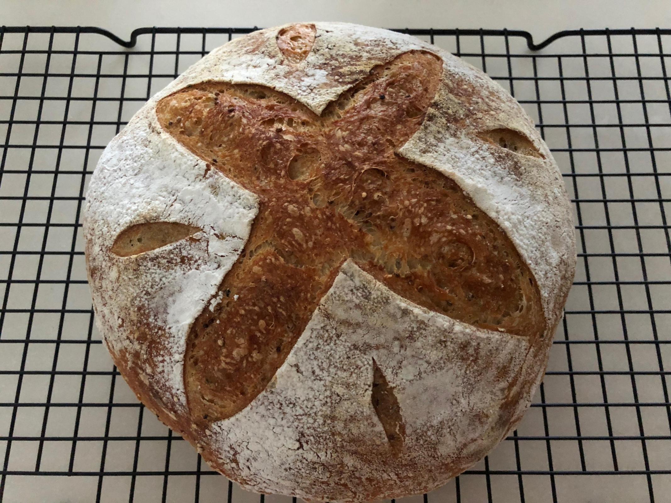 5) Cold retard in the fridge for 15hours at 37 degrees F before baking it in a cast iron combo cooker.