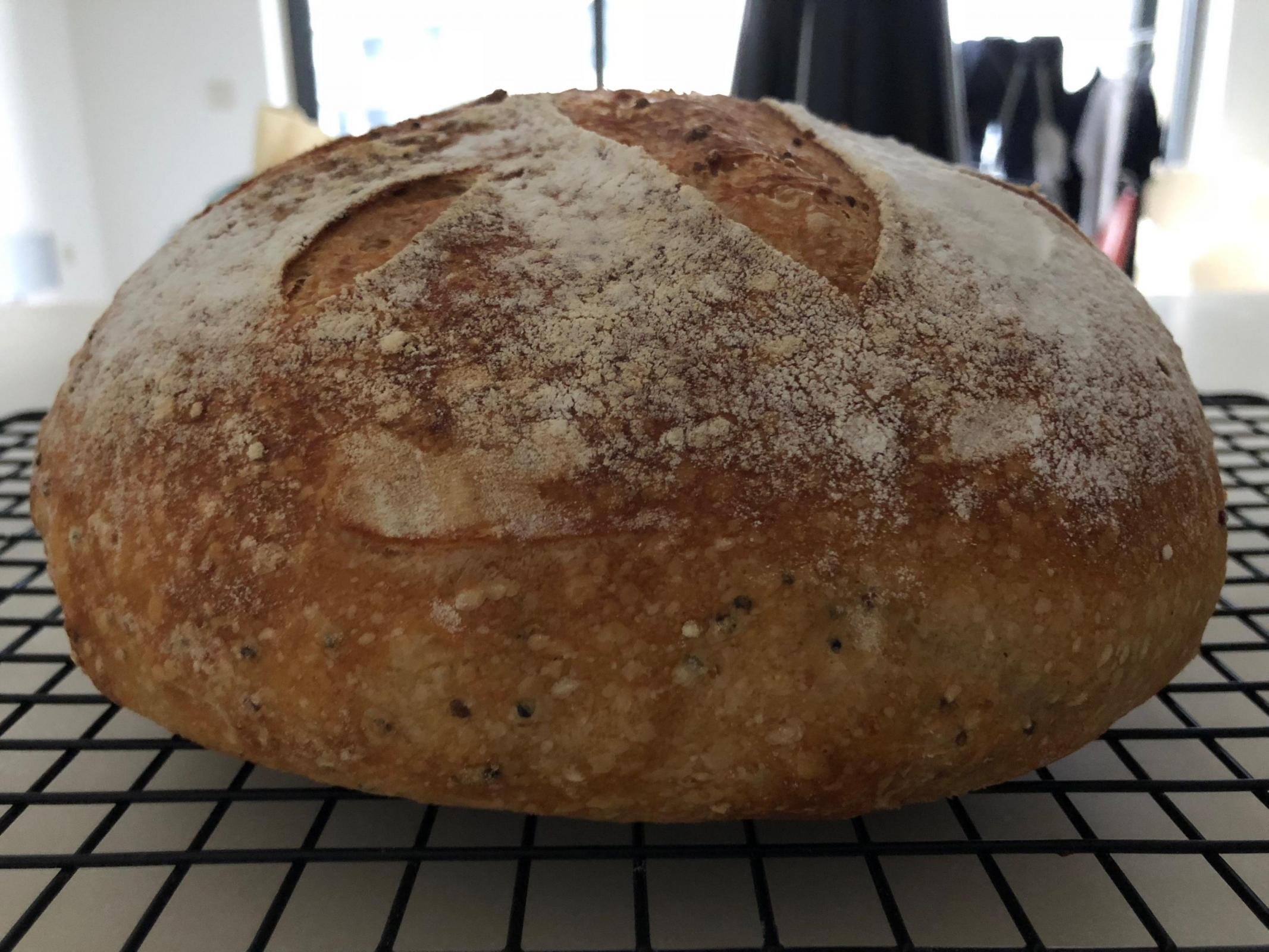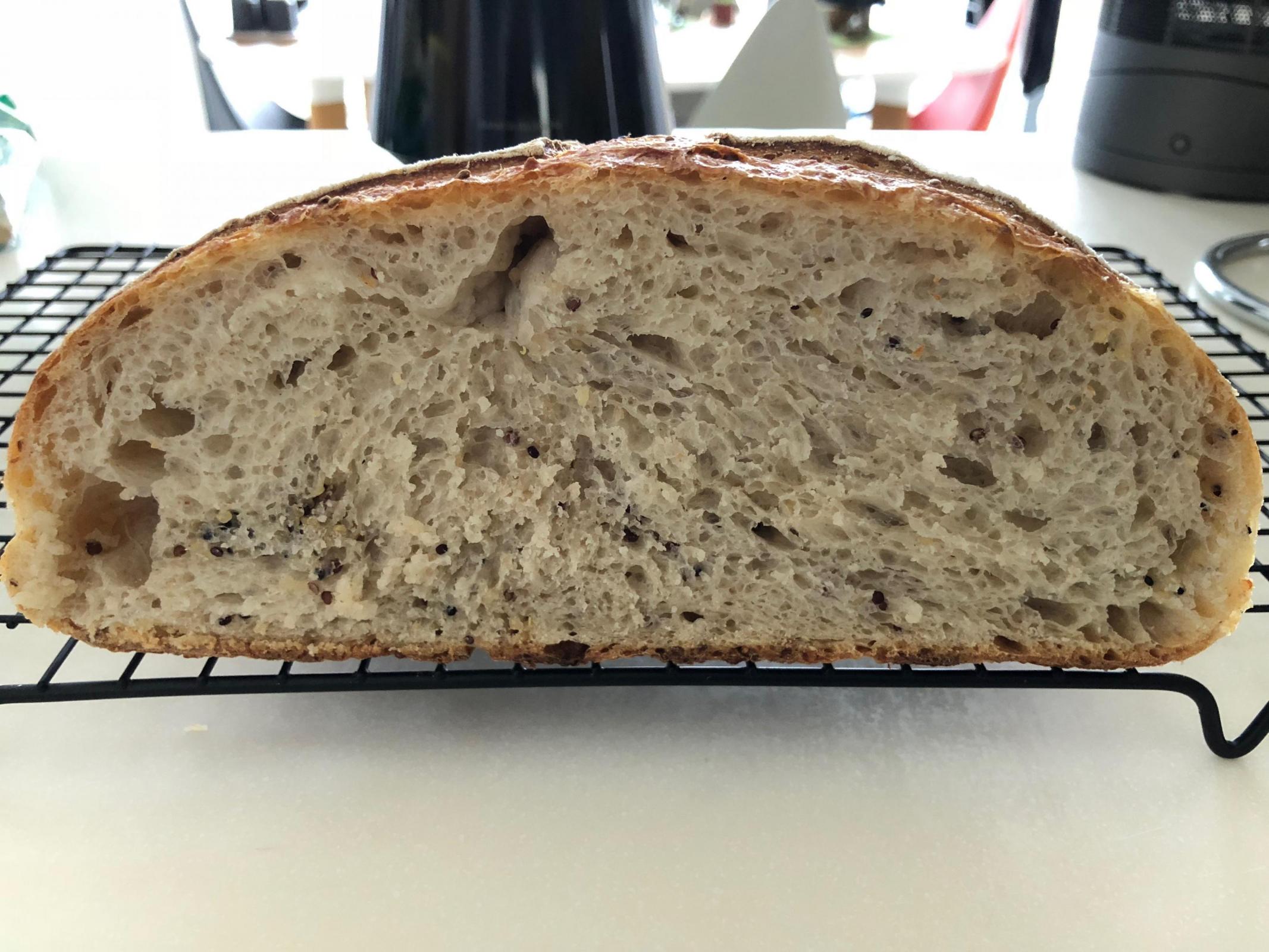 1) 90% AP flour, 10% Barley flour, 6% raw quinoa (added during 2nd stretch and fold)