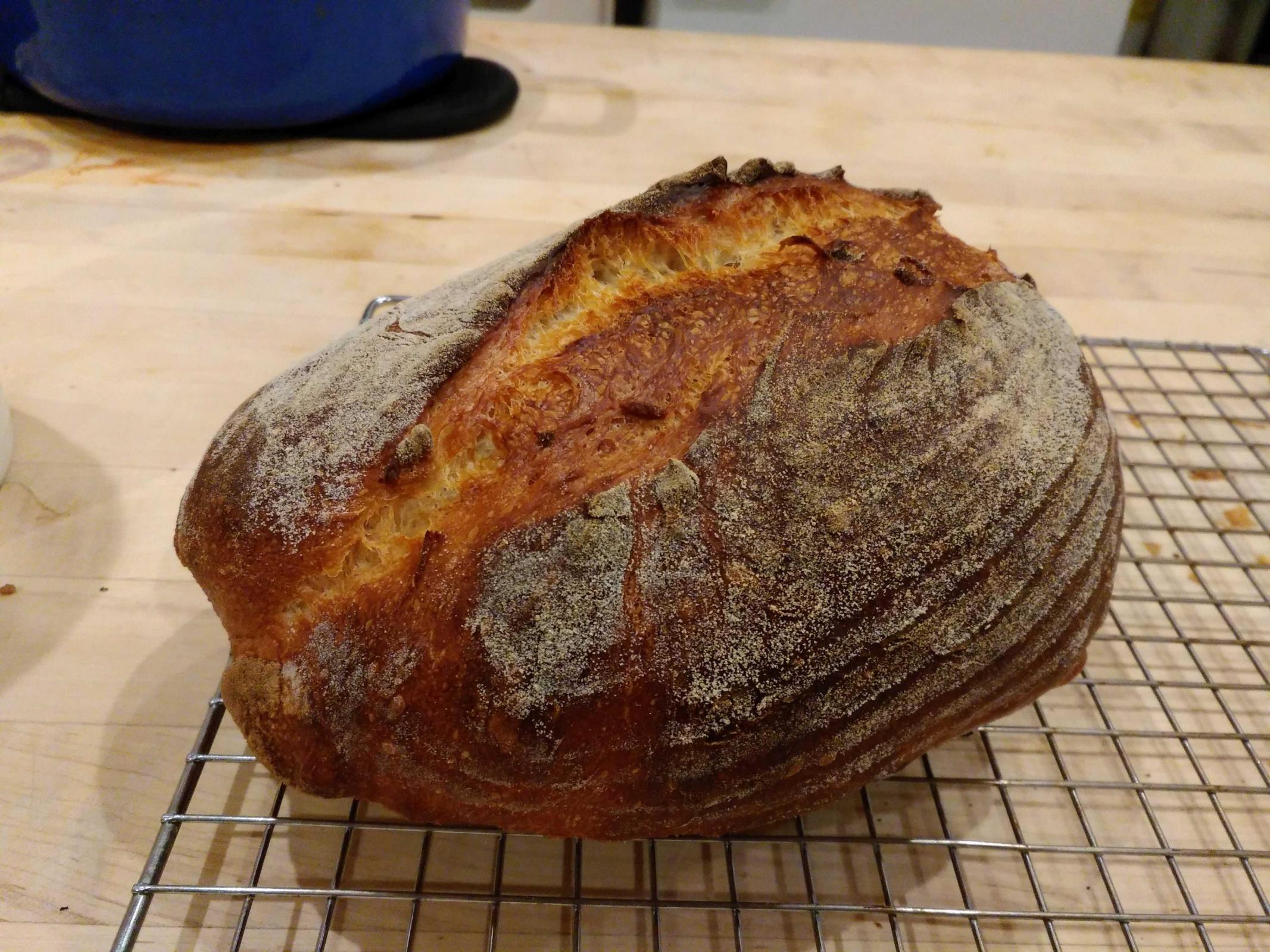 • When I remember to dampen my hands first, getting the loaves out of the banneton into the dutch oven is working ok. I can tell after another 20 loaves, it will be easy.