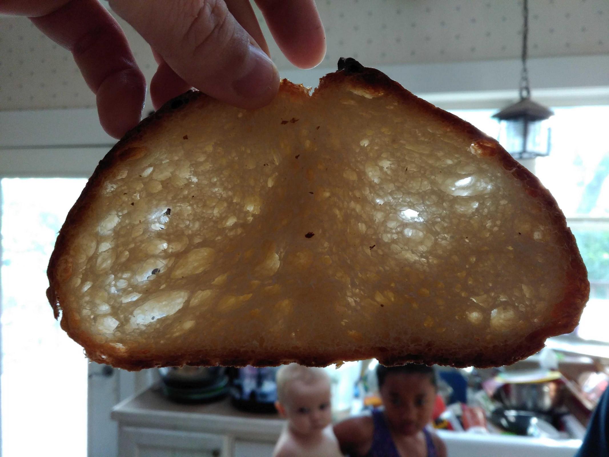 • I really think my crumb would have been even more open if I had upped the hydration by 10%, the dough was very elastic and I think it kept the air bubbles from growing larger.