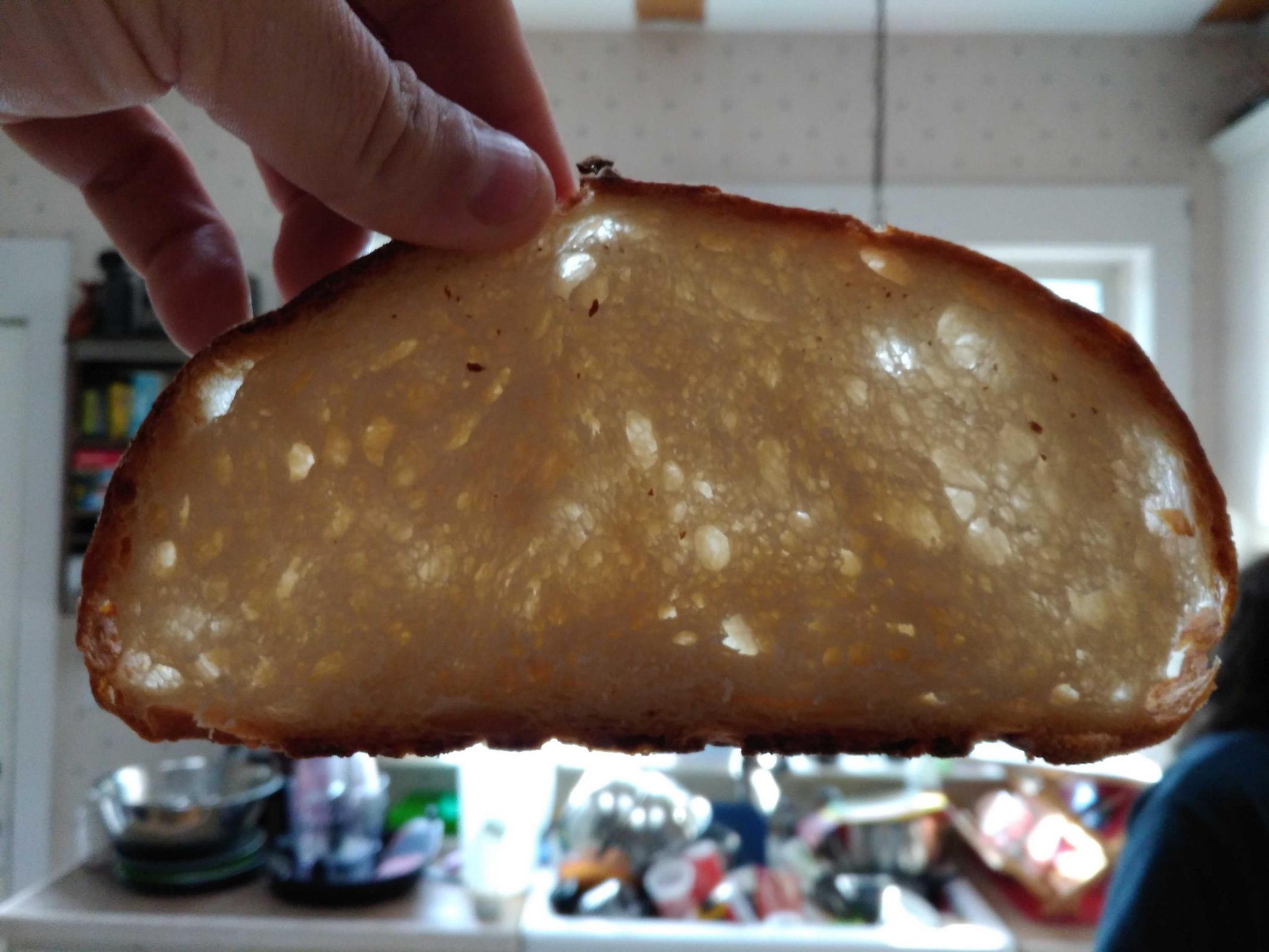 • If you look at the 2 slices of bread, one looks better than the other. The 2nd slice has a volcano formation in the middle of the loaf. Denser crumb in the volcano and more open crumb outside of it. This is because of the way I shaped the dough. I will no longer shape the dough that way.