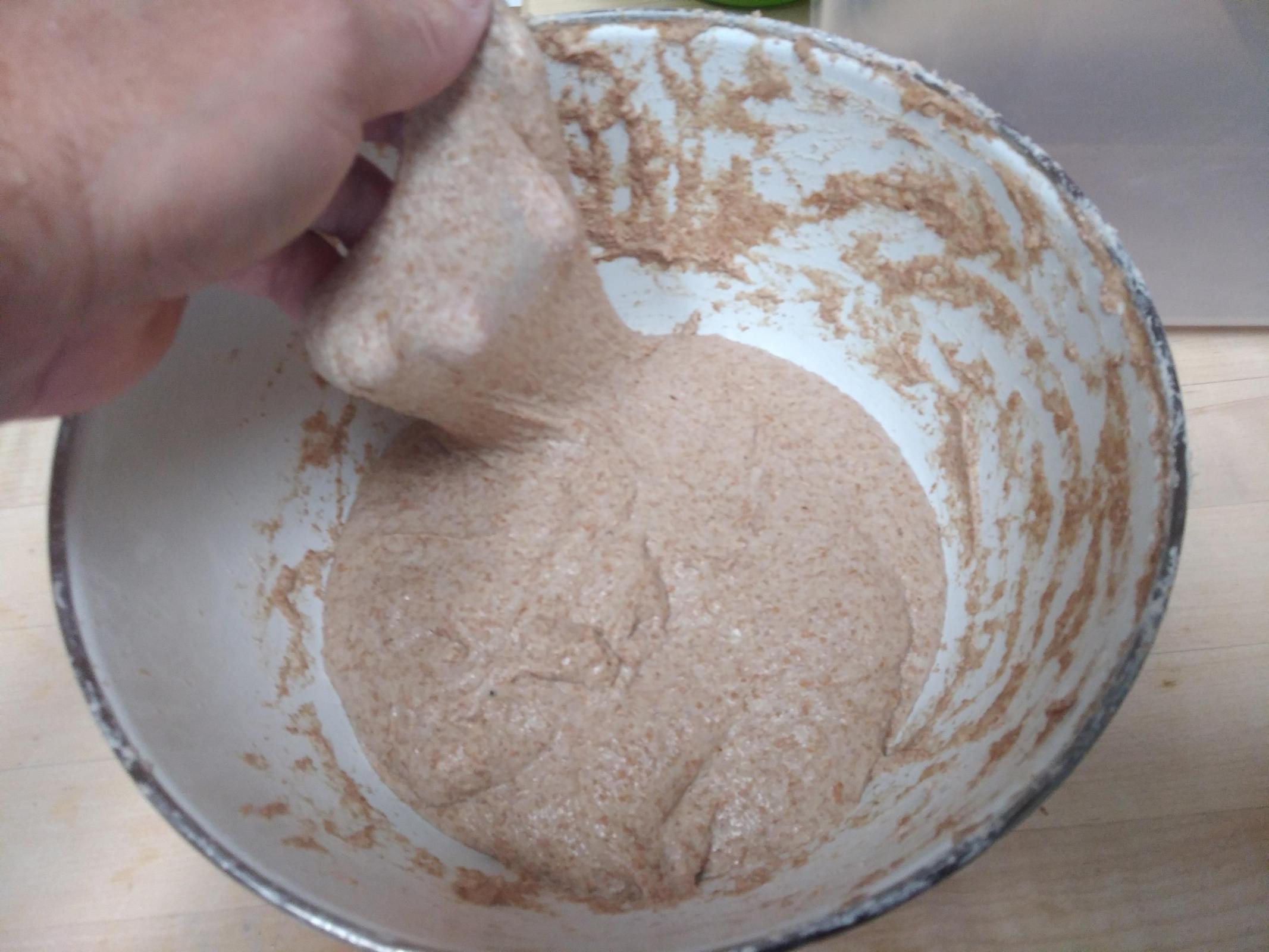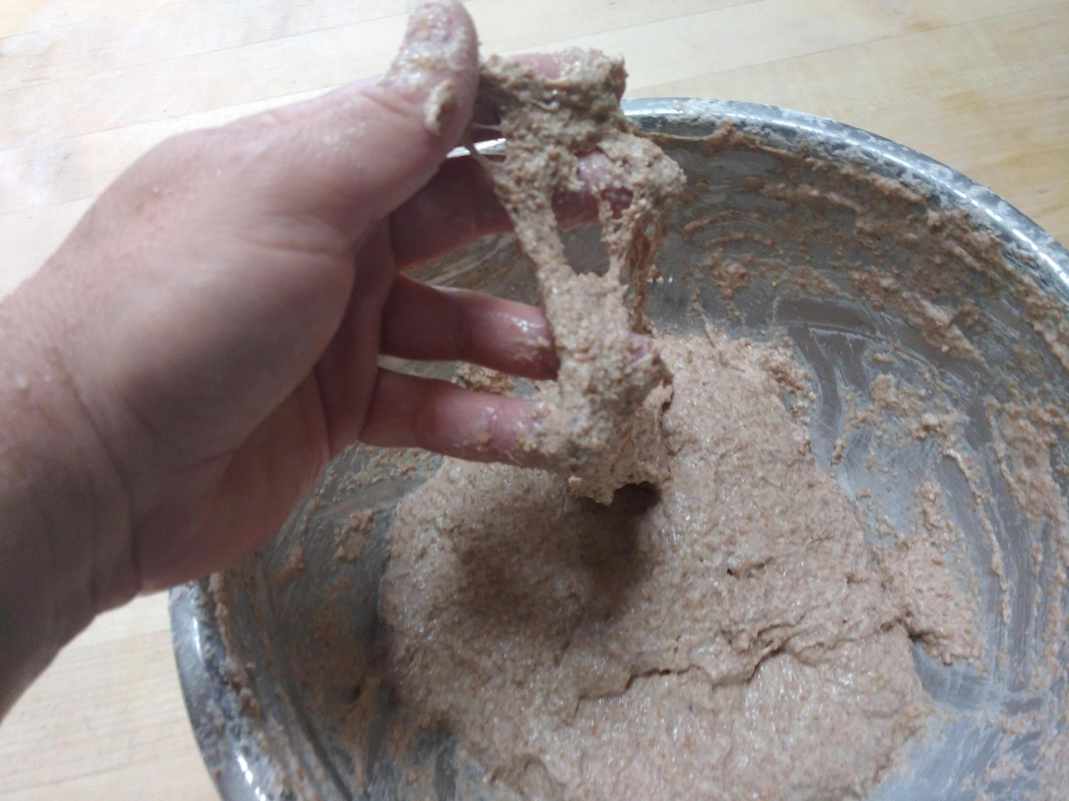 Above: The dough after 7 rounds of stretch-n-fold/sleeping-ferret/rubaud. Some gluten development, but, in general, a mess.