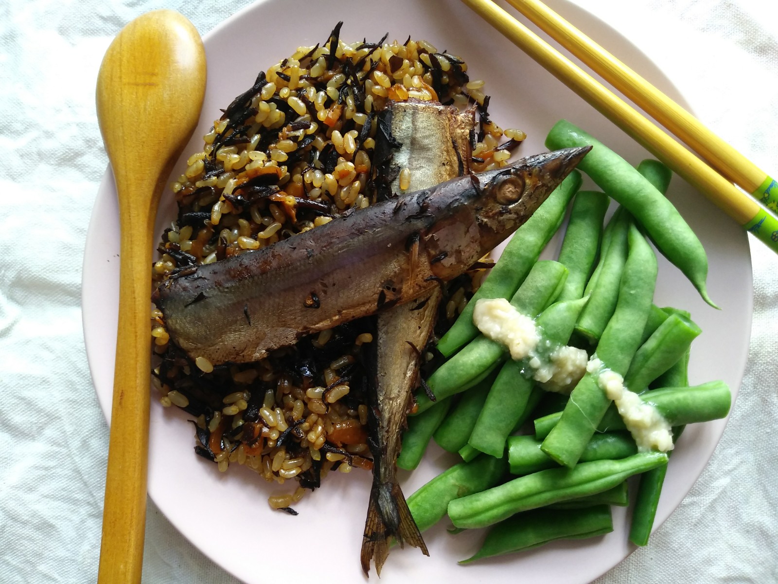Is that butter on the green beans? And can you share the recipe for the saury rice? Thanks!