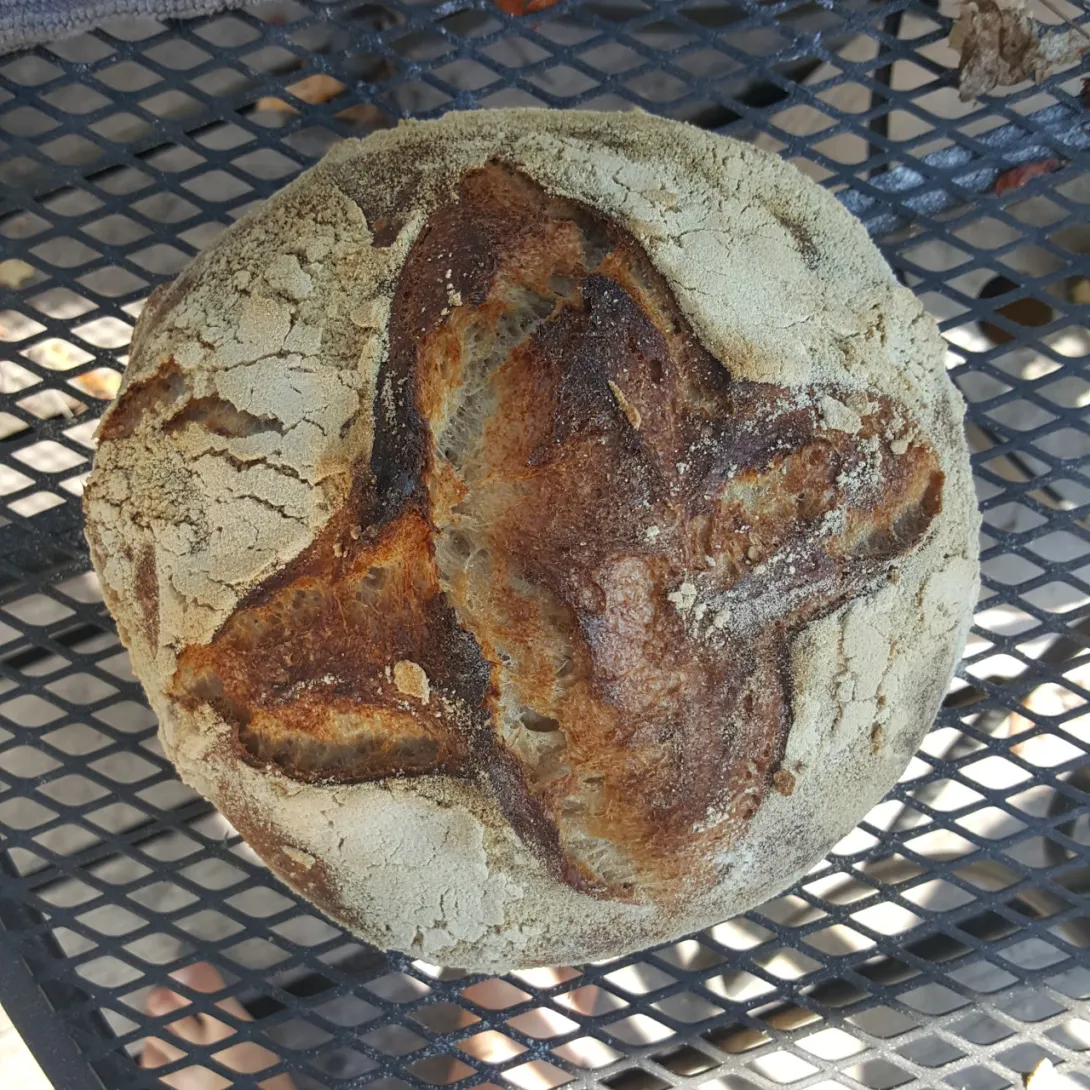 This was my first time baking bread on a gas grill (the weather was too hot to turn on the oven). I left the grill burners directly under the dutch oven on, and it burnt.