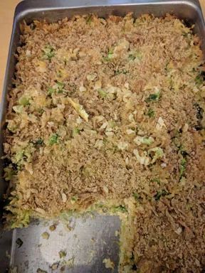 Over-proofed sourdough bread made lotsa breadcrumbs. I have been using them with abandon. Today's broccoli-brown rice-egg-cheddar-parmesan casserole was immensely improved by a layer of sourgough breadcrumbs on top. I baked the casserole long enough that the crumbs became extra crunchy.