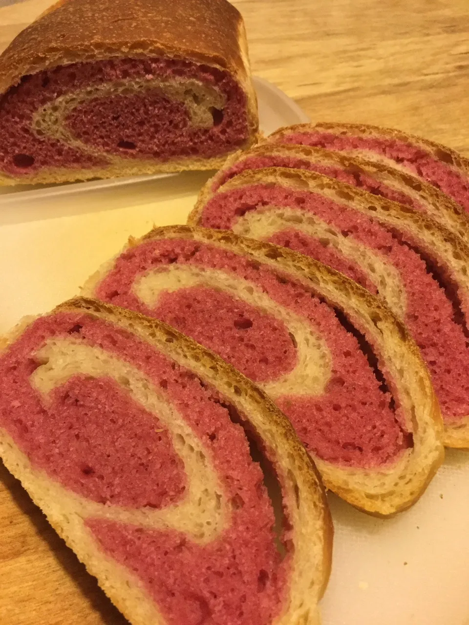 There has been some interest in pink doughs.I used the tip from an NHK baker in Japan who said to encase the pink (or green orcolored) dough in a white dough. I made a pink dough colored with Persian mulberry juice and it came out pink! Log in or register to post comments Love it. How does it taste? Log in or register to post comments i replaced the water with a juice squeezed from some Persian mulberries- not much taste unlike when eating the berries fresh. Log in or register to post comments