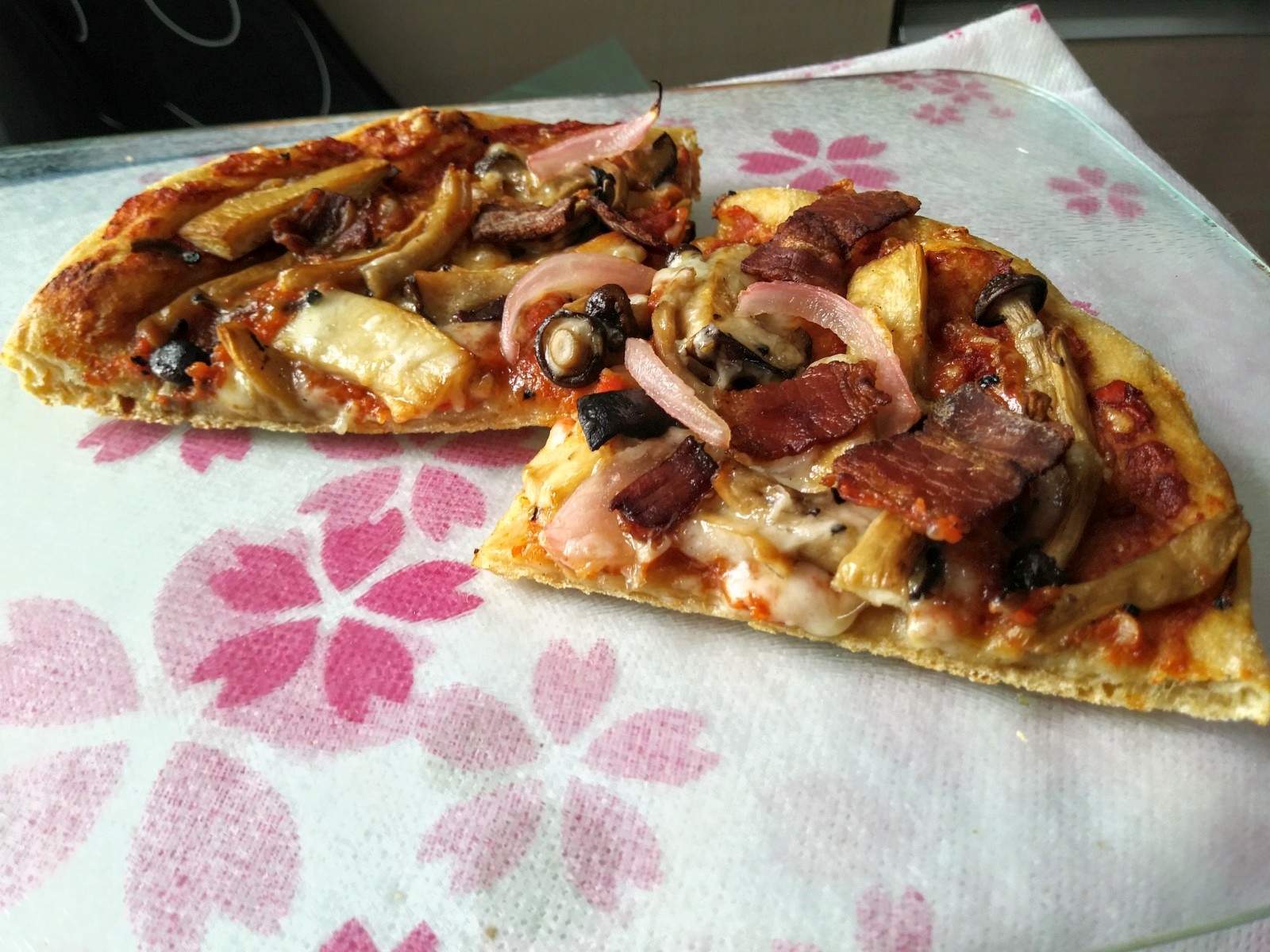 Pizza for Breakfast: Caramelized mushrooms, pickled red onions, pancetta and provolone 100% WW pizza with spicy&smoky roasted red peppers sun-dried tomatoes sauce