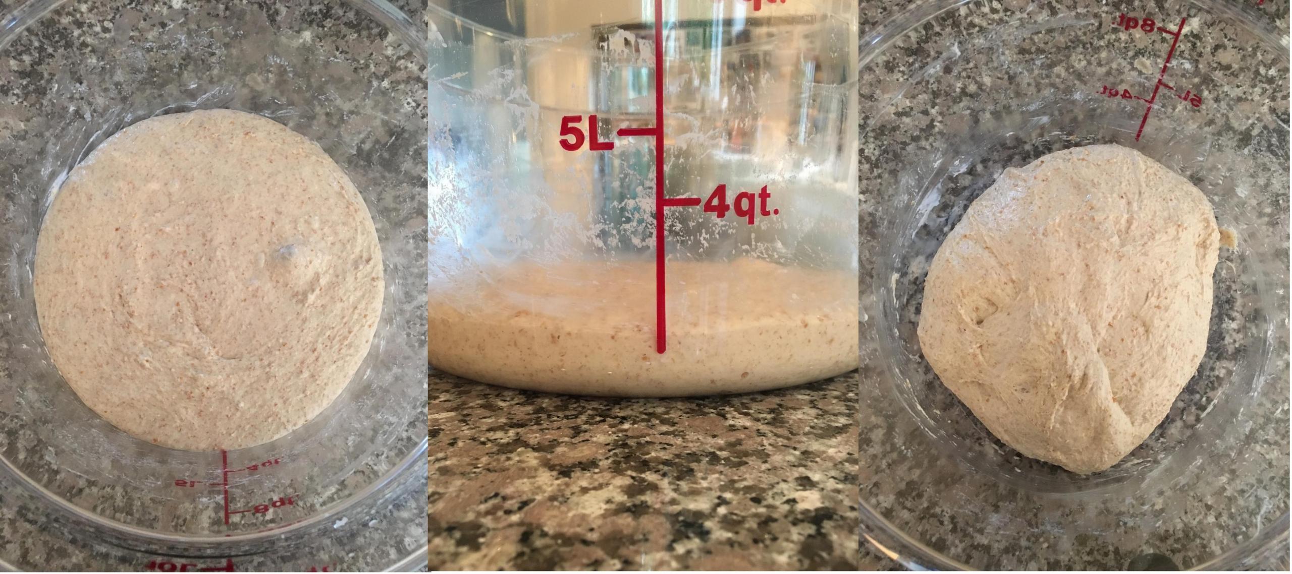 Forkish suggests two S&F sessions, so now it is time to watch the dough during the remainder of the bulk fermentation.  After one more hour, the dough had risen and there were enough bubbles, and the surface was looking puffy and a bit jiggly.  Time to pour the dough onto the countertop.