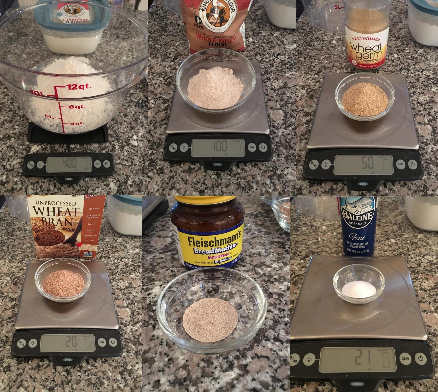 Along with the usual flour (all-purpose and some whole wheat), water, salt, and yeast, this bread includes wheat germ and wheat bran.  The first step of course is to weigh the various ingredients. [Note: Forkish uses 3/4 of a teaspoon of instant yeast, but I cut that back to 1/2 teaspoon based on prior experience with this dough.]