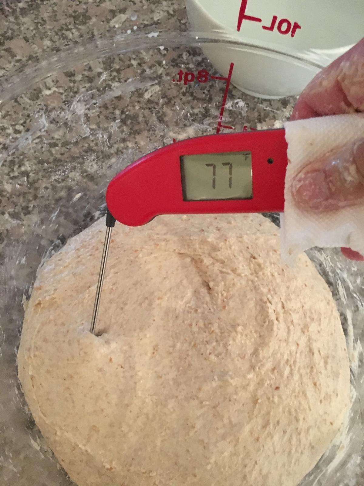 In the beginning I use a dough scraper to help distribute the water and poolish among the dry stuff, but eventually I switch to using my hand.  A nearby bowl of water for dipping my hand helps to keep too much of the dough from clinging, but this is a sticky mixture.  Perhaps eight to ten minutes of pretty vigorous kneading (a combination of Forkish's pincer, Wilson's tugging, and some pulling) is followed by  letting the dough rest for about three minutes and then another couple of minutes of kneading to make sure I like the feel of the dough.  (It has developed some gluten, exhibits elasticity, and hangs together when I pull.)  I then check the dough temperature and put the lid on for a thirty minute period.
