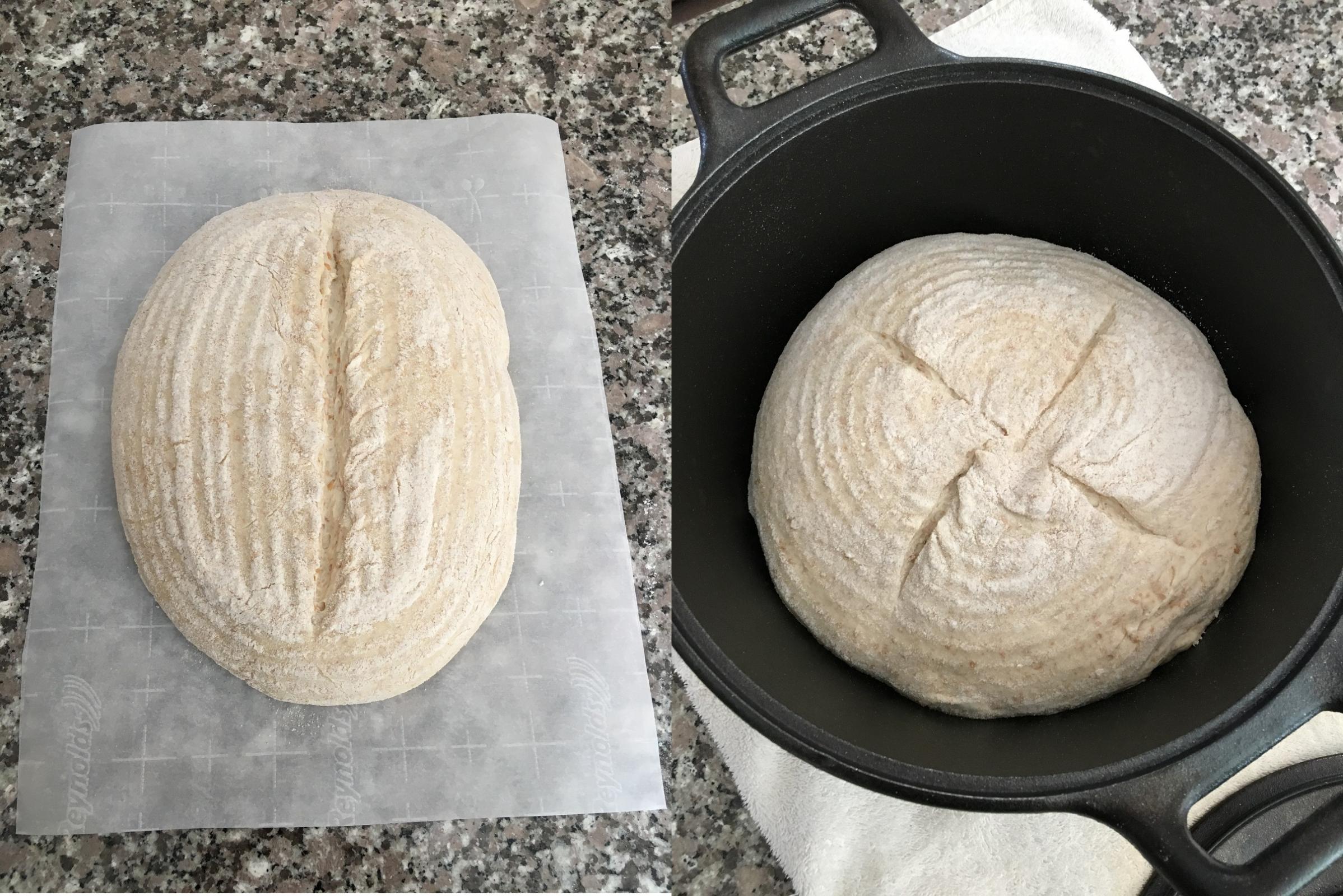 The batard went onto a sheet of parchment paper and after being scored was placed onto a peel and into the oven on a baking stone at 450F.  The boule was plopped onto my hand and then quickly cradled by both hands and placed into a Dutch oven, scored, and put into the oven at 475F.