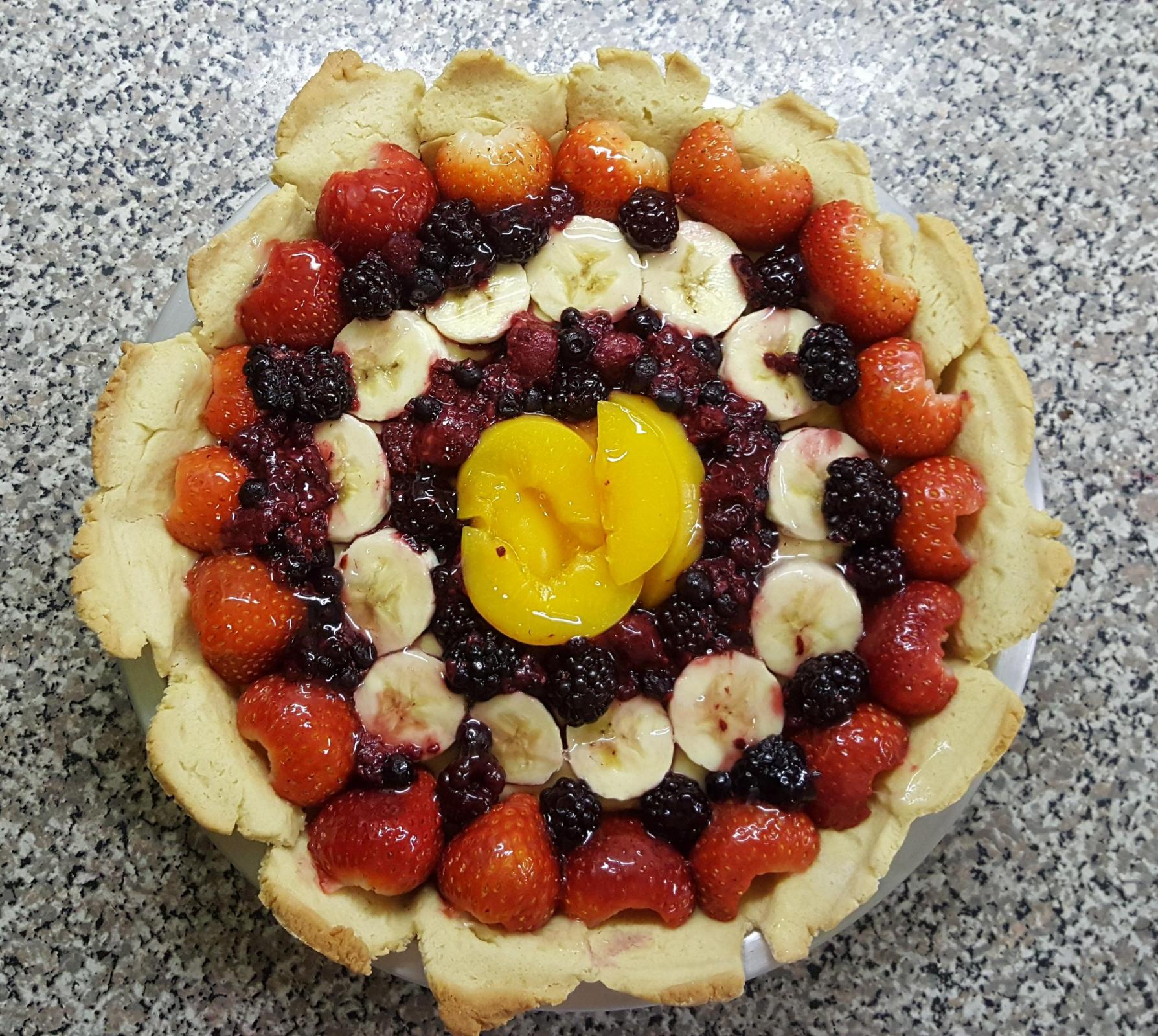 We par baked the shell for 20 minutes to get it golden and let it cool before the cream/ cheese filling went in. The fruits were arranged on top and the blue berries added at the last minute. I would have rather used strawberries for some color but we were out – no worries.