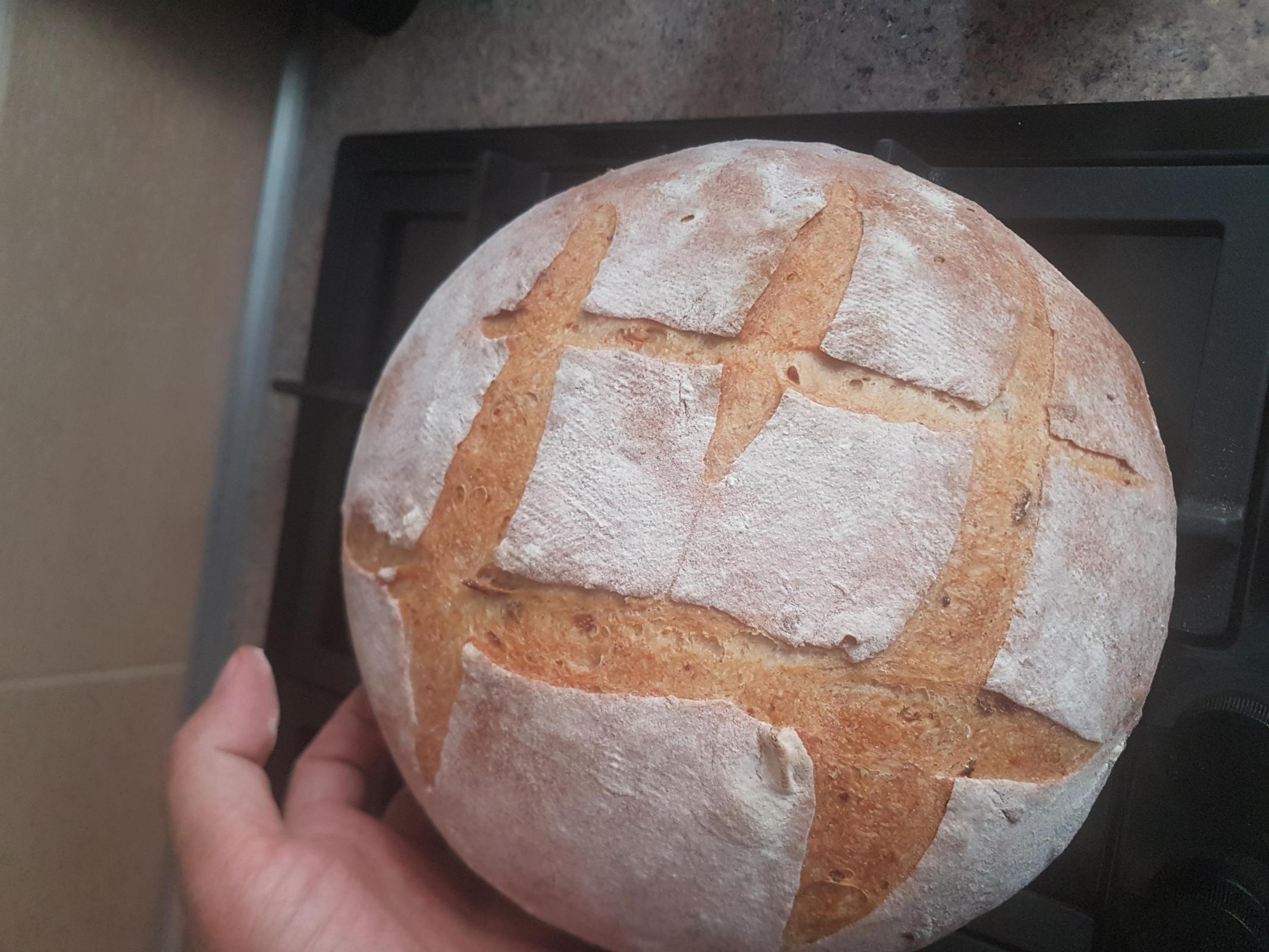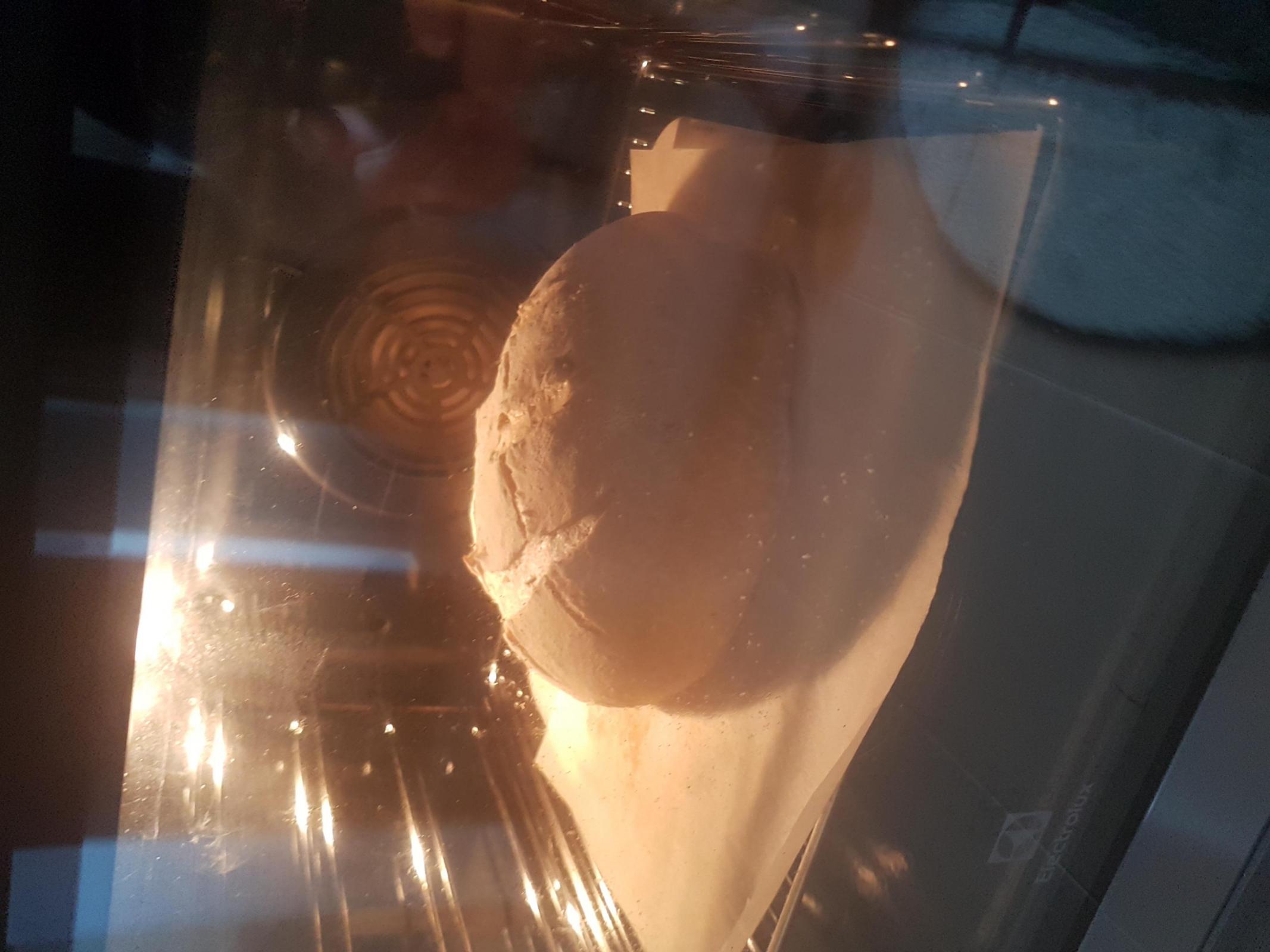 Sure, i couldn't resist to taste it after 20-30 minutes. I bake it at 230 celsius with steam , then reduce at 200 for a long baking because of humidity from roasted potatoes - total time was about 50 minutes and sound hollow at the end .