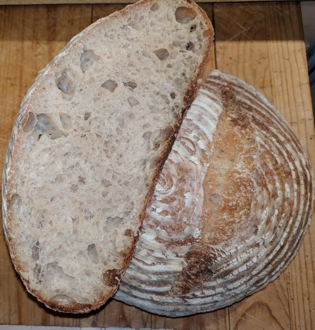 I used a tartine bread recipe I found on nytimes. See attached image. Had good flavor, though it didn't taste very "sour", maybe had just a bit more character than bread made from a poolish. I'm pretty happy with the crumb, the crust is good too though perhaps I had too much flour in the proofing basket.