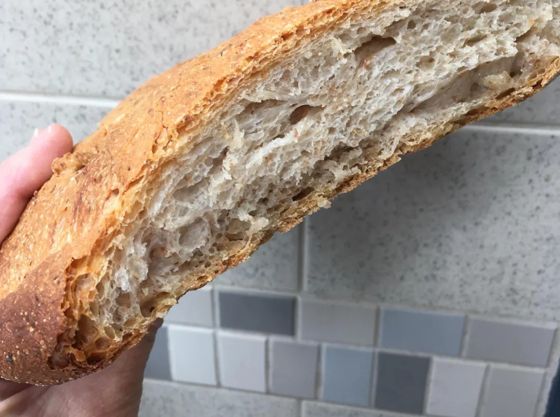 Secondly - I have been and like the overnight method. I make and prepare in the early evening and then either put it in the fridge, at which point it doesn't seem to 'do' much. In the morning I then need to proof it in the oven [approx 2hrs] before baking. If I leave it out on the worktop overnight (approx 20C) it goes mad and then I need to let it re rise again anyway in the morning... Sometimes it is quite floppy and the loaves a bit flat (see pic) - but the texture is lovely, soft and bouncy, crusty crust but the slices are thin.... How do I get big round cracked boules, like I see on the forum here ??