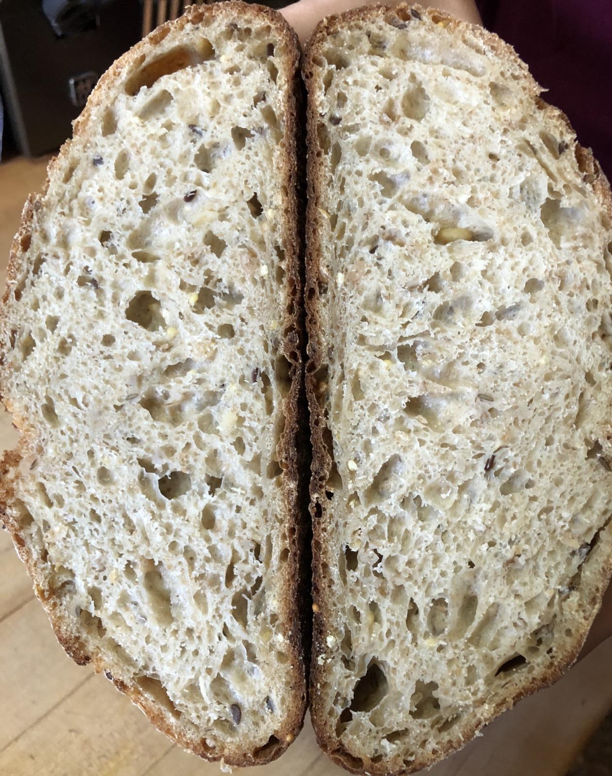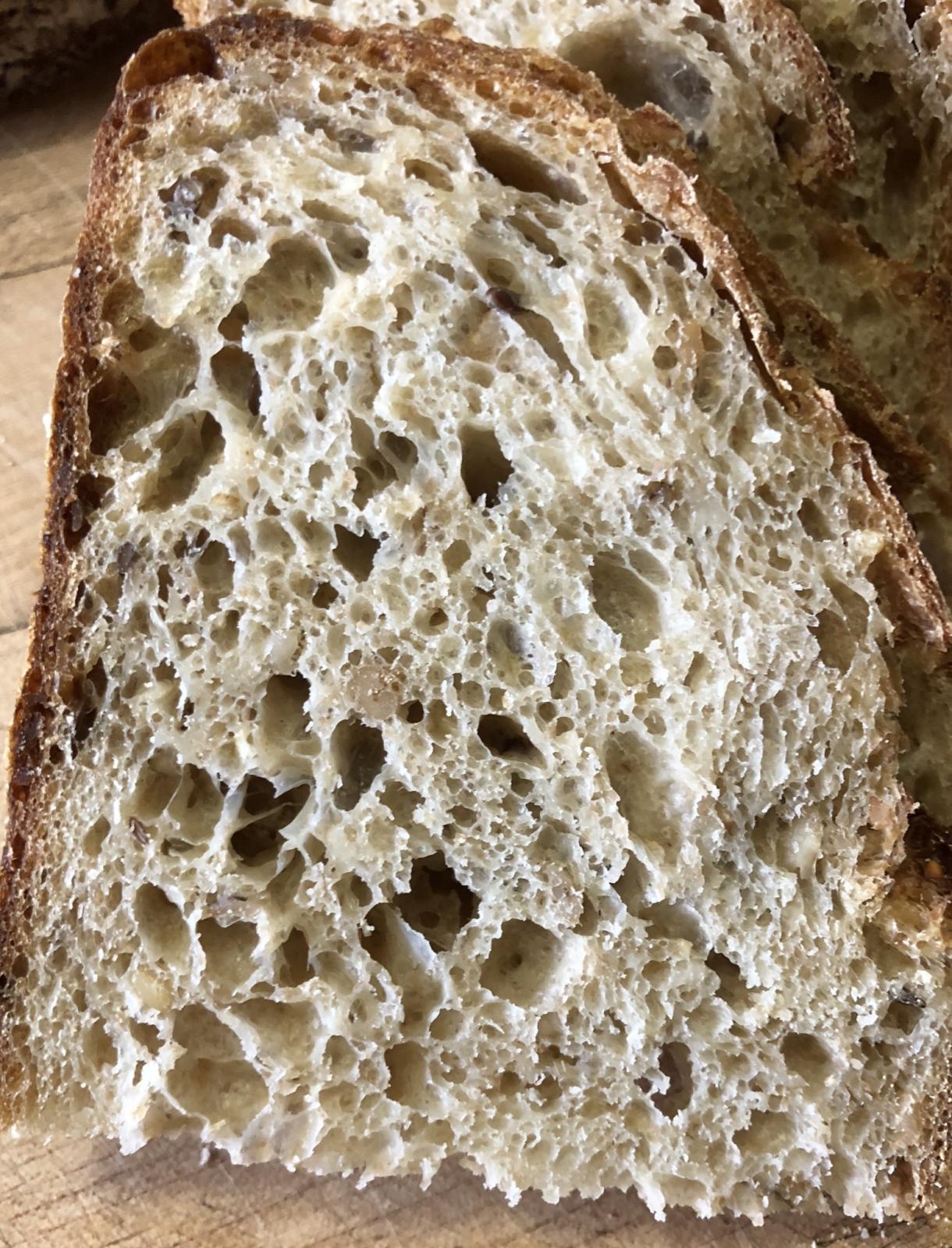 I had frozen this loaf since we had an abundance of bread when I baked this. We cut into this one tonight. Once again, I am very happy with the crumb!