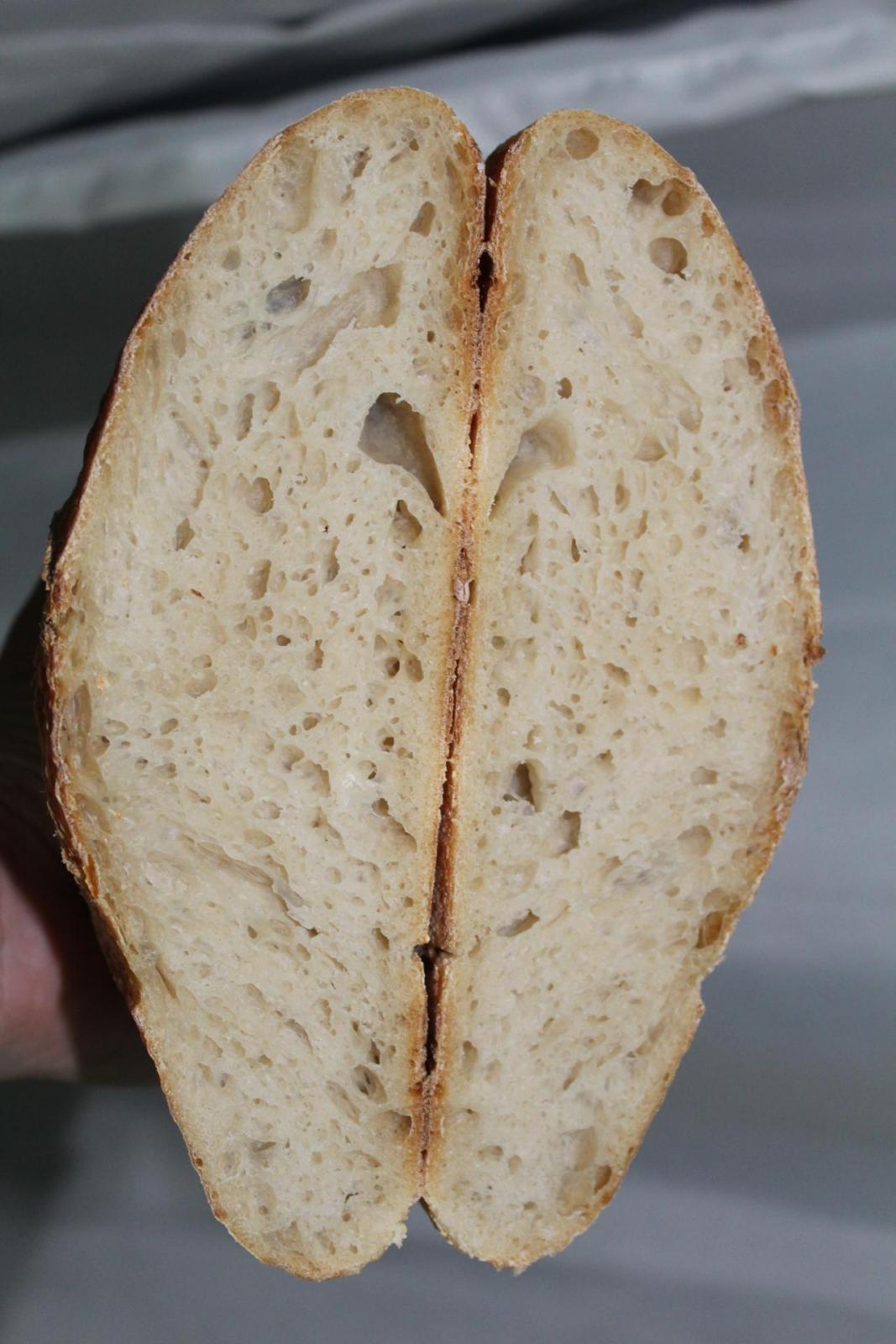 The two loaves were my usual recipe, 1000g dough, 100% white flour, 65.03% water, 2.19% salt, 18.58% levain (100% hydration). Final hydration, 68%. Temperature in my refrigerator was about 3 ° C and in my kitchen during the day ranged between 25-27 ° C.