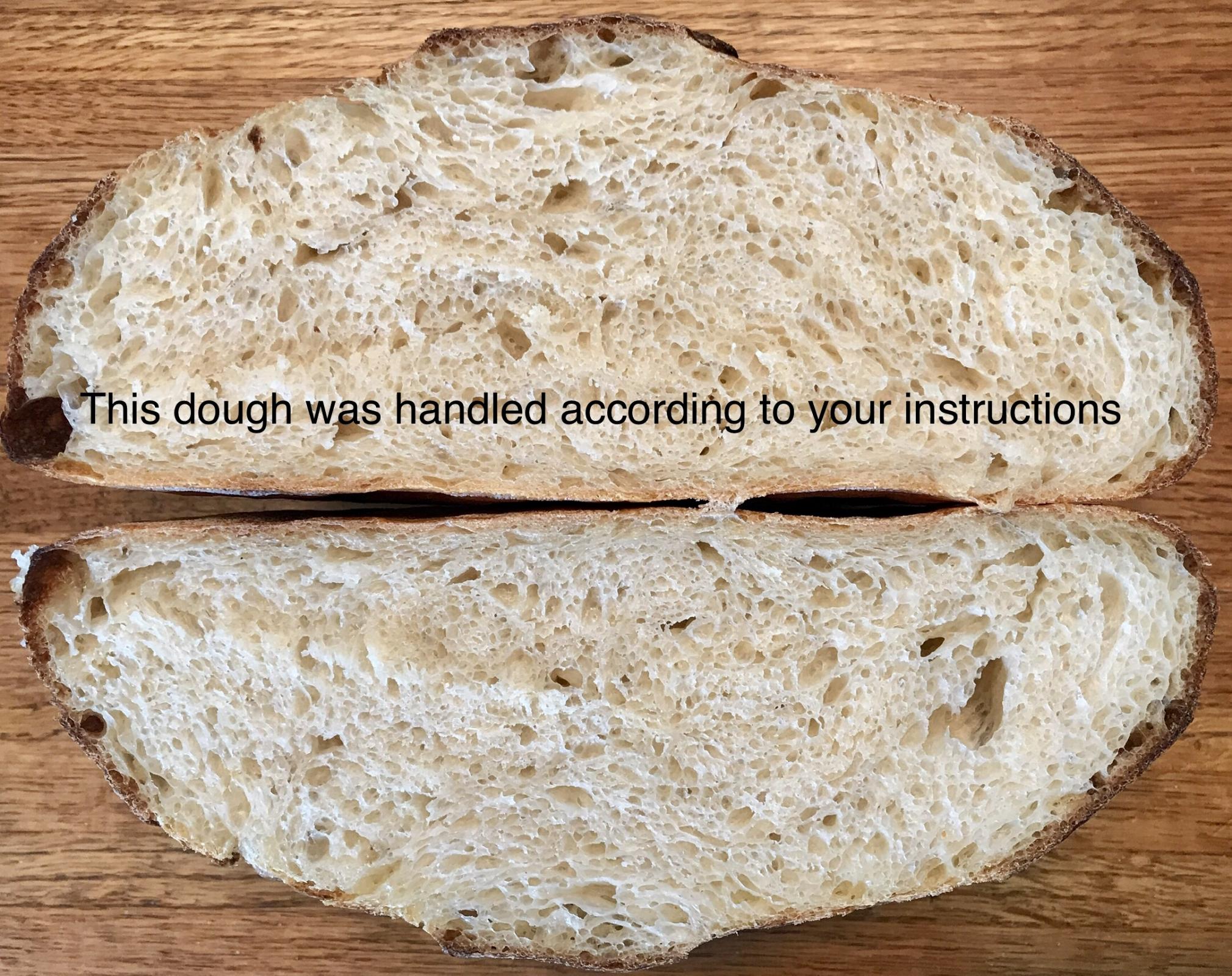 The text on the crumb below was meant for the author of the bread, so it shouldn’t make sense in this post. Please disregard. The bread below is Loaf B and rec’d no machine mixing or kneading.
