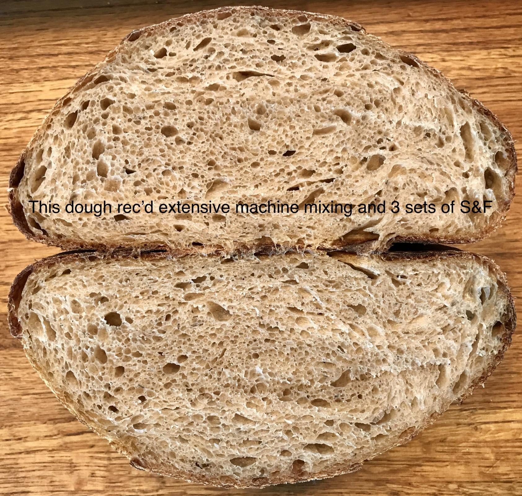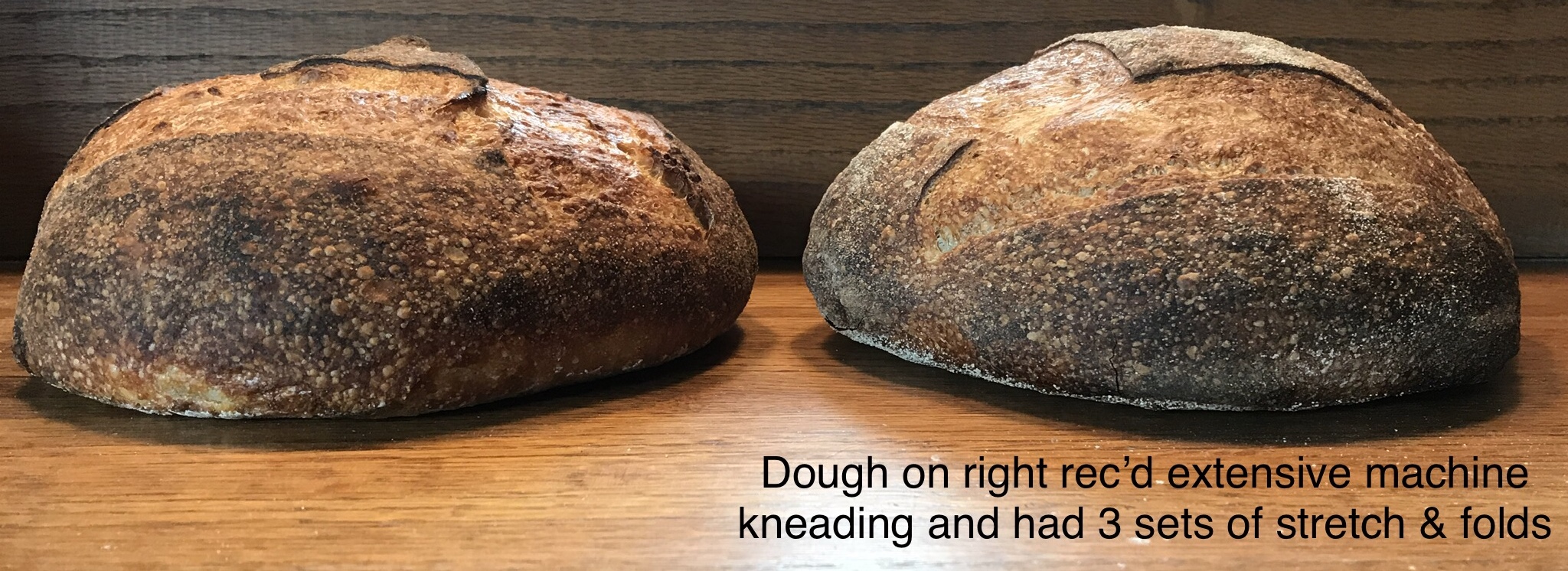 Conclusions - the dough thta rec’d the machine kneading was slightly stronger, held its shape better, and baked slightly higher. The crumb was a little nicer. See images below. NOTE - the darker crumb is the result of using 3g chocolate malt for identification.
