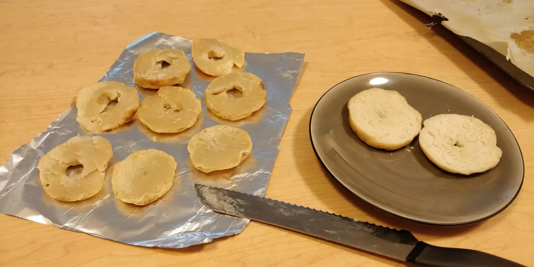 The attached picture is what the bagels made today looked like. The one on the plate (and another which I ate) were pretty good for a first attempt. The ones on the foil though were far from perfect.