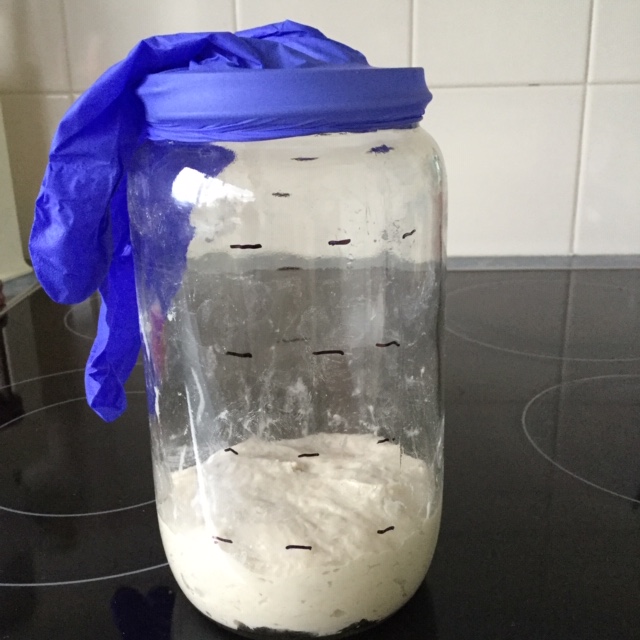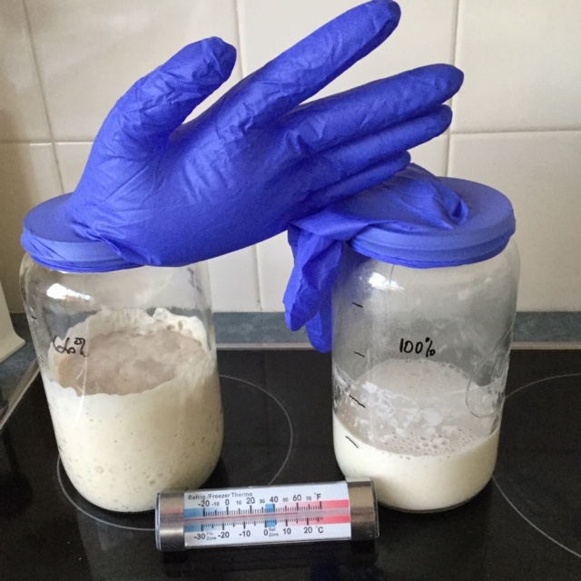 Marked another jar in 200 ml steps and placed 230 g starter in each labelled jar, topped off with disposable glove.