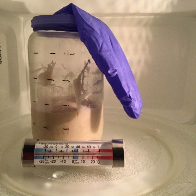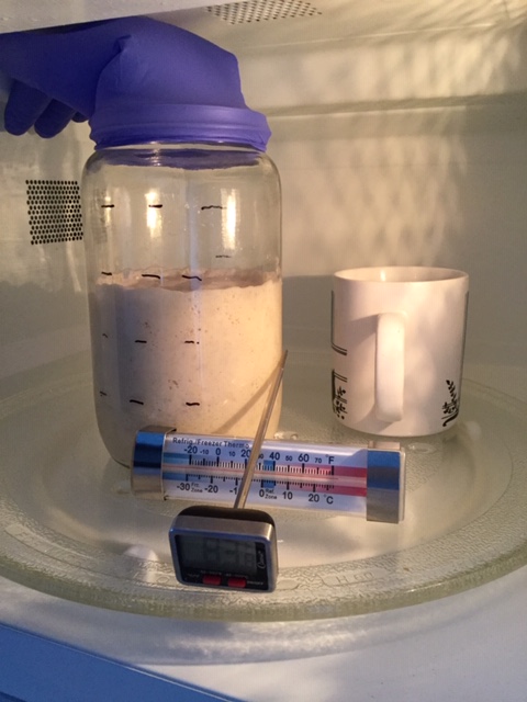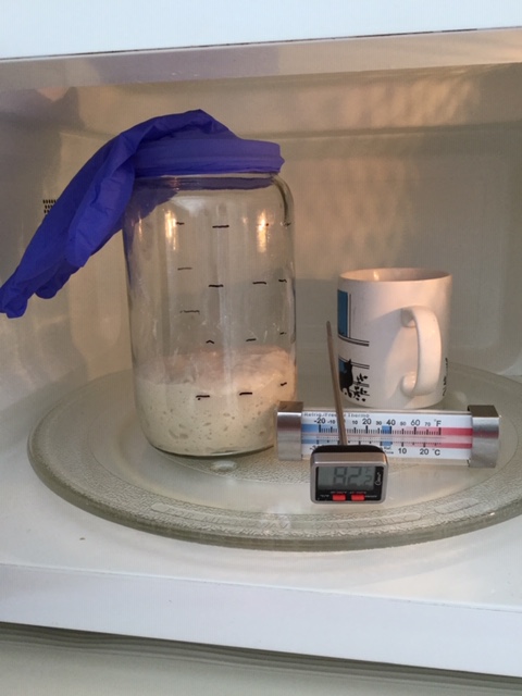 In the morning I mixed up a new batch of 240 g starter and placed in a 1 litre glass preserving jar. I marked the sides every 200 ml as the starter was approx. 200 ml in volume. I wanted to see just how active my starter is at around 80 deg F. I topped the jar off with a glove to see what gas production there was. I preheated a cup of water in my microwave, thought I had it pretty much at 80 deg F but it was actually more like 82 – 85 deg F all day. The door was propped open and temperature remains quite stable.