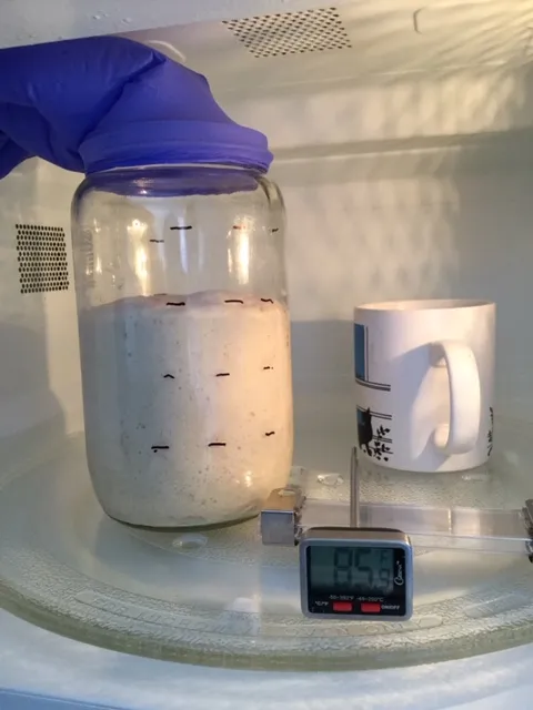 At this point I stirred the starter down, level was just a bit above 200 ml mark, shut microwave and left overnight to see what would happen.