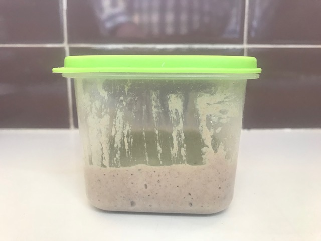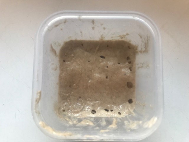 In preparing for the 123 community bake on Saturday morning I hauled out my wooden dough board and gave it a brief scraping down. My usual maintenance regime is a simple scrape after use, then an airing outdoors in the sun, weather permitting, followed by a light scrape prior to next using. This time I decided apply science to the "light scrape" residue by dropping the bits (<2g) into a plastic container to which I added another <2g water, closed the lid and waited for the evening. I then added 20 g each of water and flour, and Sunday morning it presented a decent outcome as shown in these pictures.