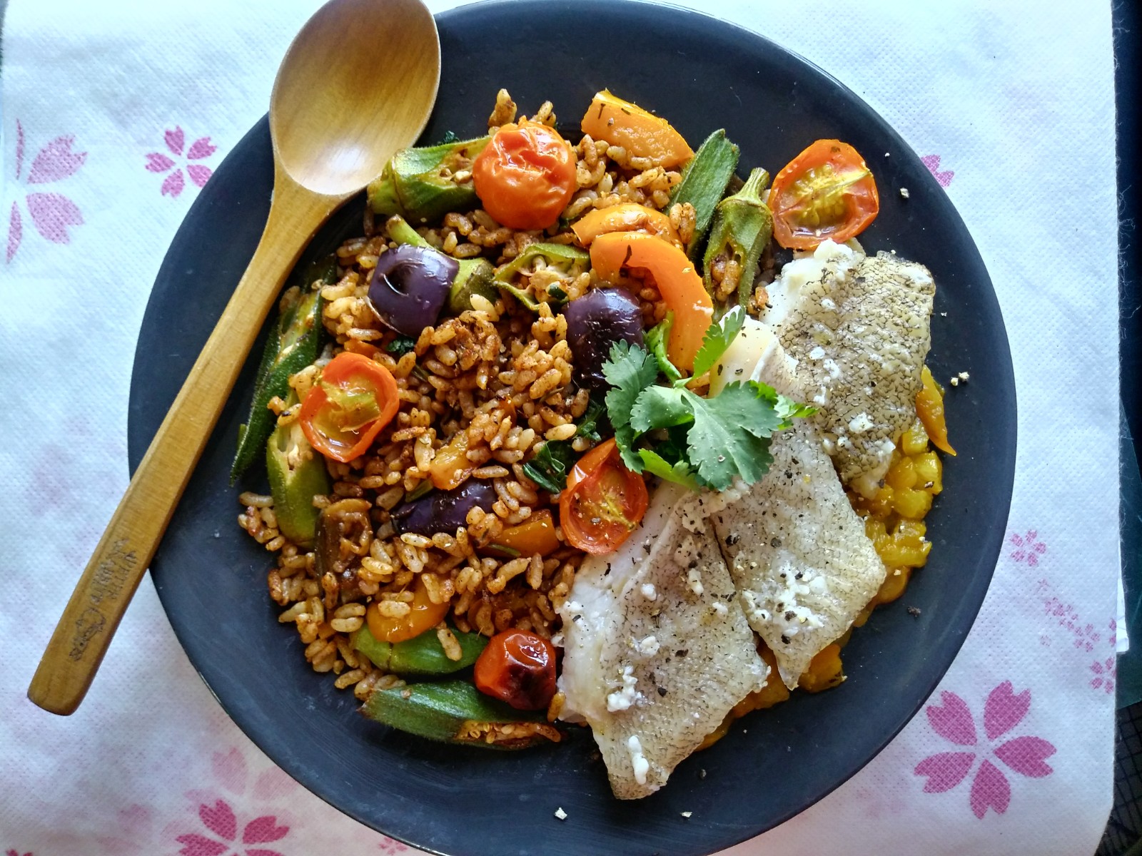Spiced rice with pan grilled veggies, baked grouper and roasted yellow peppers relish
