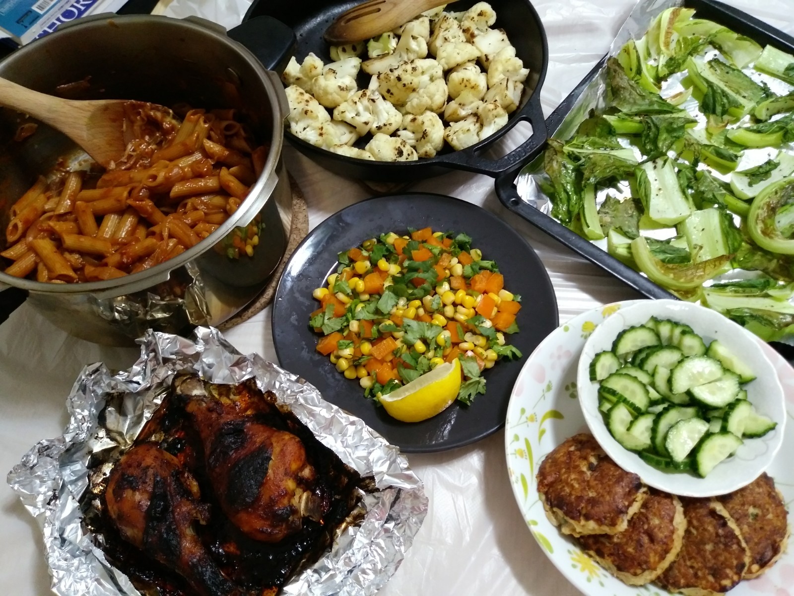 Crab cakes (recipe recommended by dabrownman, I swapped 80% mayo with homemade yogurt and they turned out great) with quick pickled cucumbers, corn, orange peppers & cilantro salsa, baked spiced chicken drumsticks, penne in parmesan tomatoes sauce, pan grilled cauliflower, caramelized cauliflower leaves (…again…so you know how much we love them)