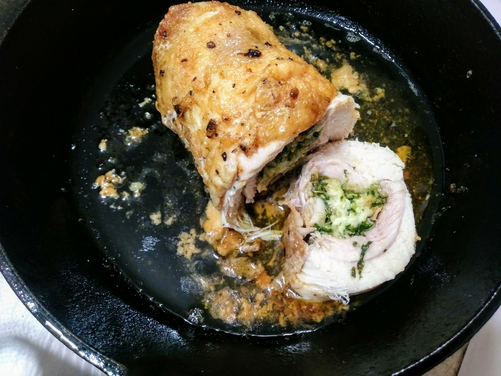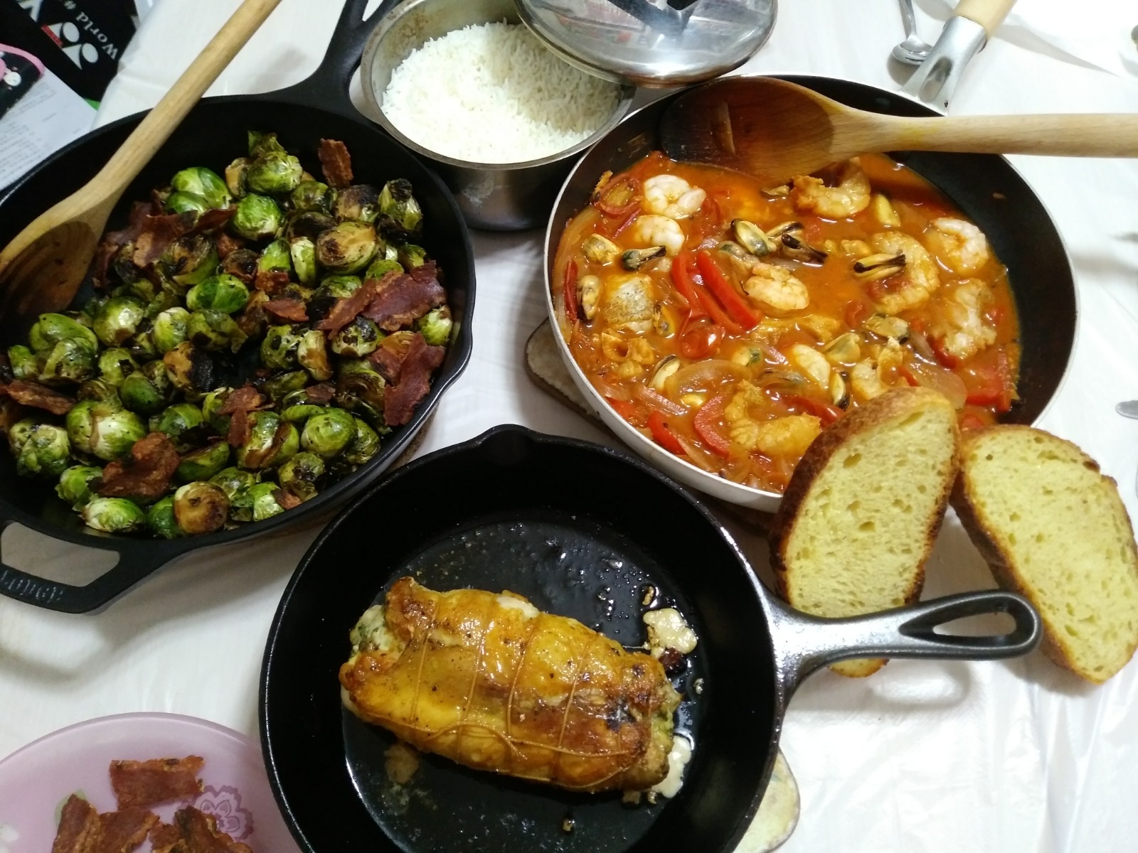 Italian seafood stew, balsamic glazed brussel sprouts with bacon and cilantro parmesan pesto stuffed chicken roll
