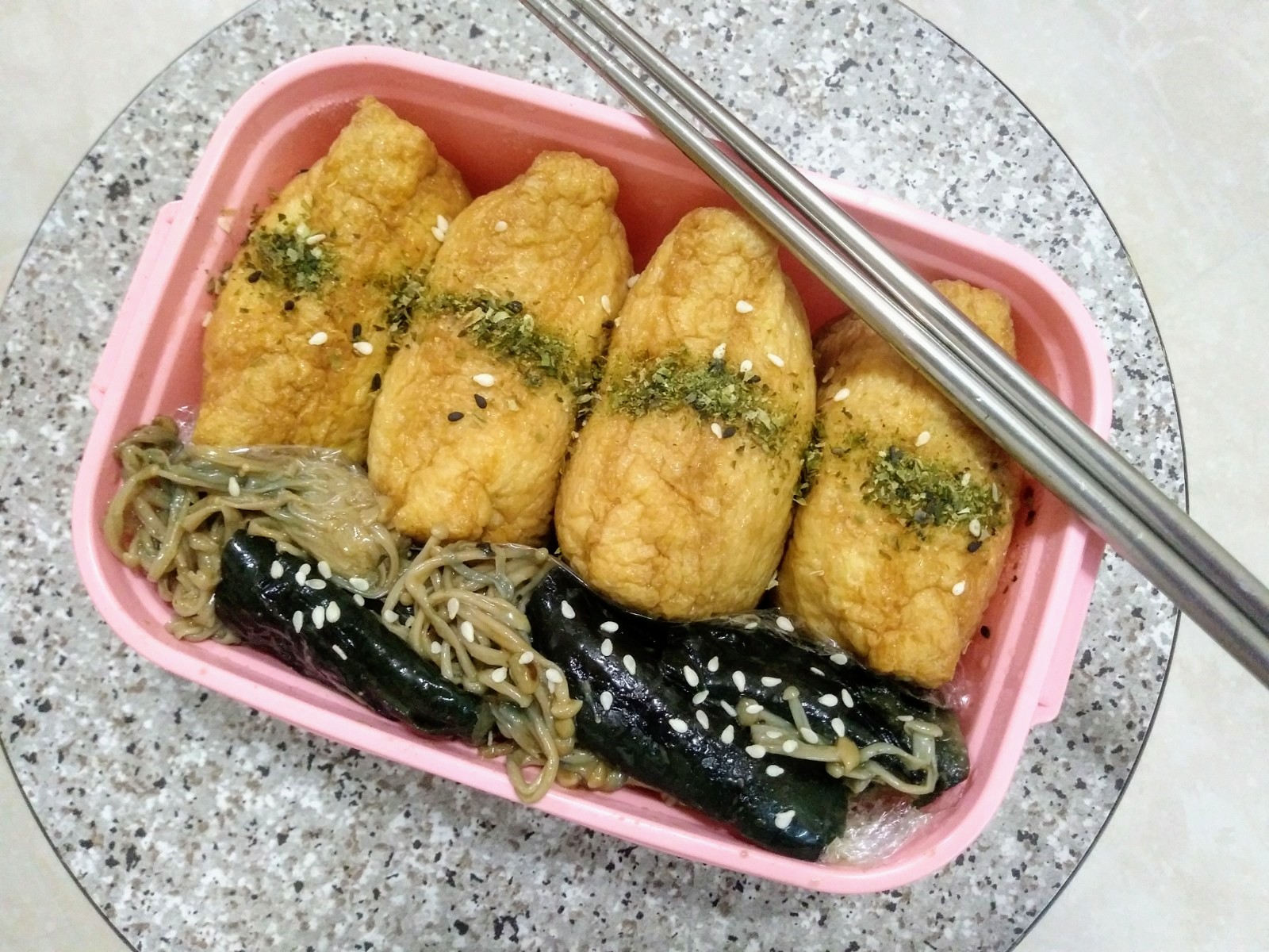 There's another eggplant side dish in the pink bento box. It's right next to the tofu skin sushi. I figure that you probably wouldn't get along with my mom very well since she loves eggplant as well. You two will be fighting over the last eggplant!