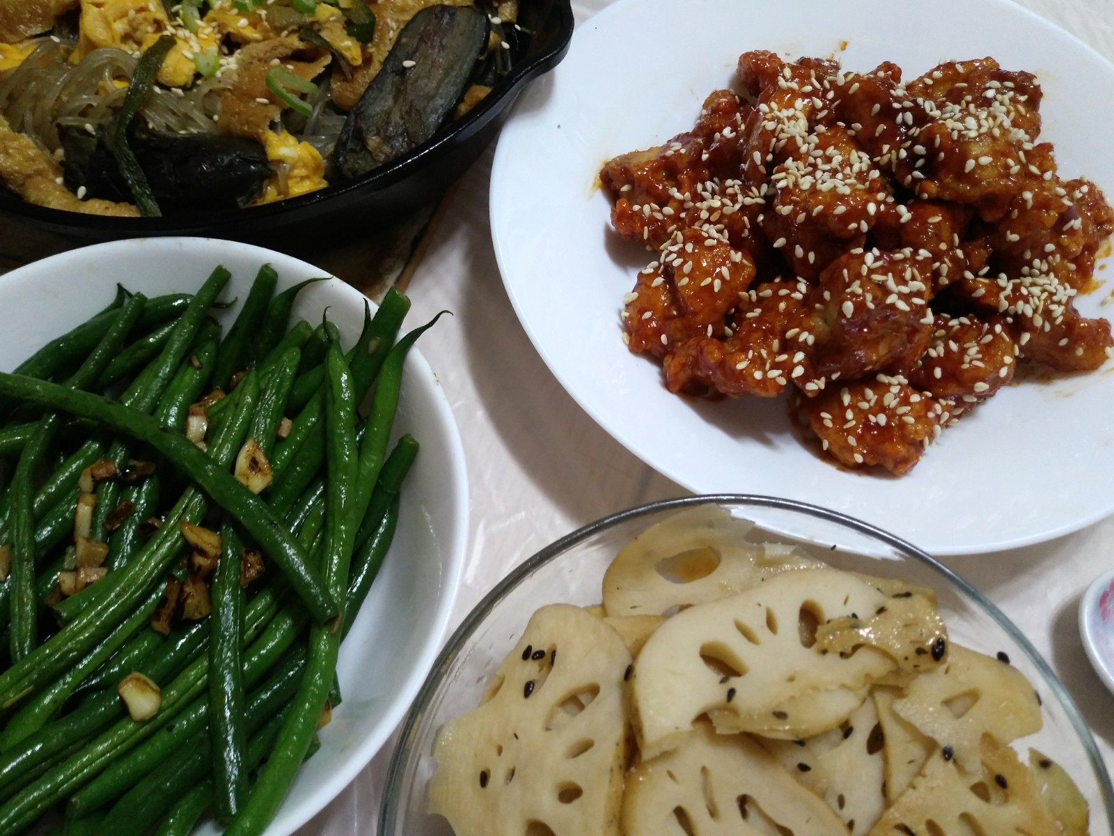 Lotus roots, garlicky green beans, bean sprouts, eggplants, tofu skins & eggs sweet potatoes noodles and Korean fried chicken with short grain rice