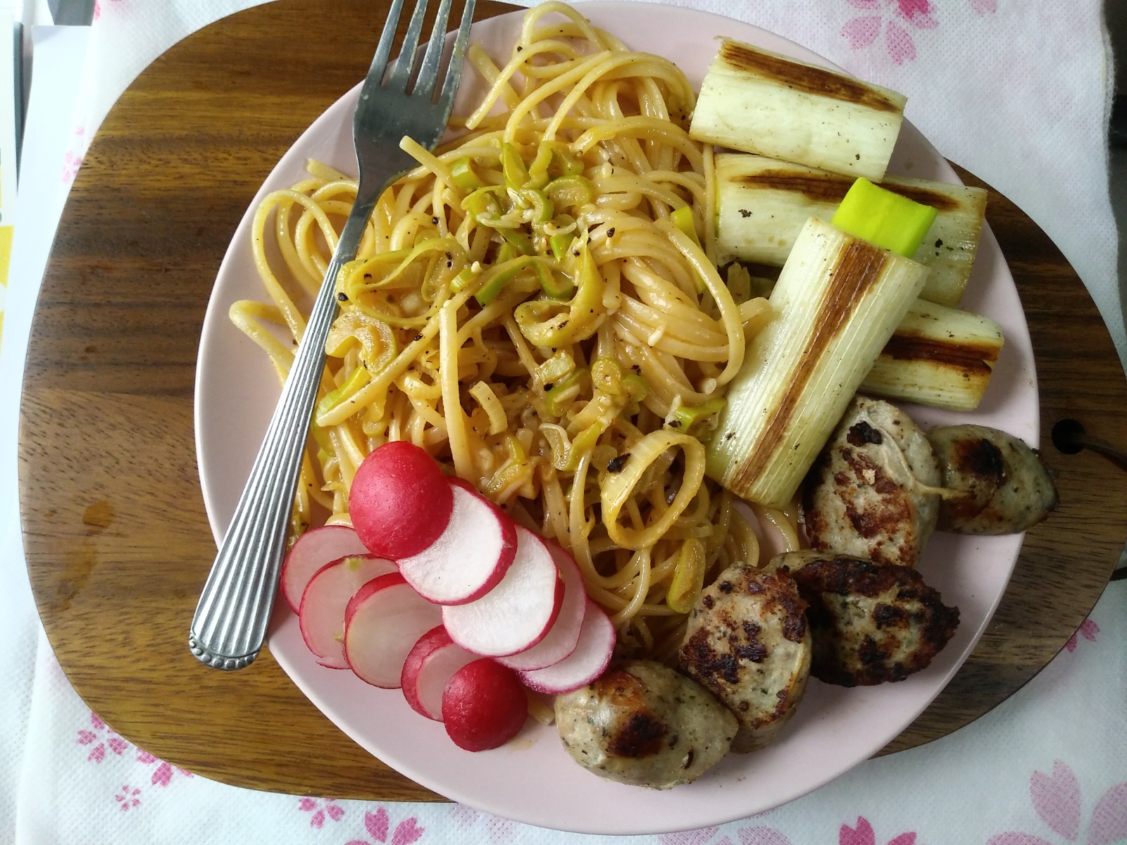 Leek & white wine carbonara (what?) with radishes, pan grilled leeks and sausages