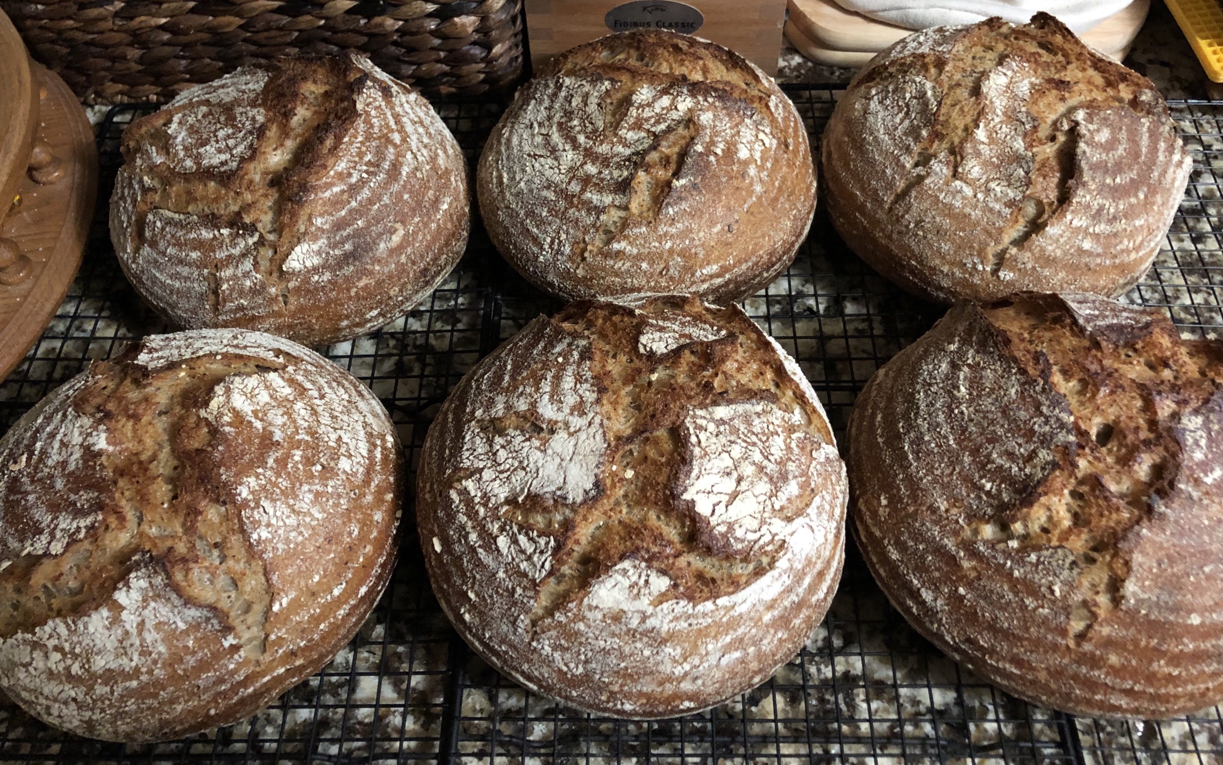 As to making so many loaves, there are another 6 that you can’t see. ? If I am making one batch, I might as well make 4 batches which makes a total of 12 loaves. I can manage 12 loaves at once by hand. I have the tubs, the bannetons and the fridge space. As to the oven, I bake 6 at a time.