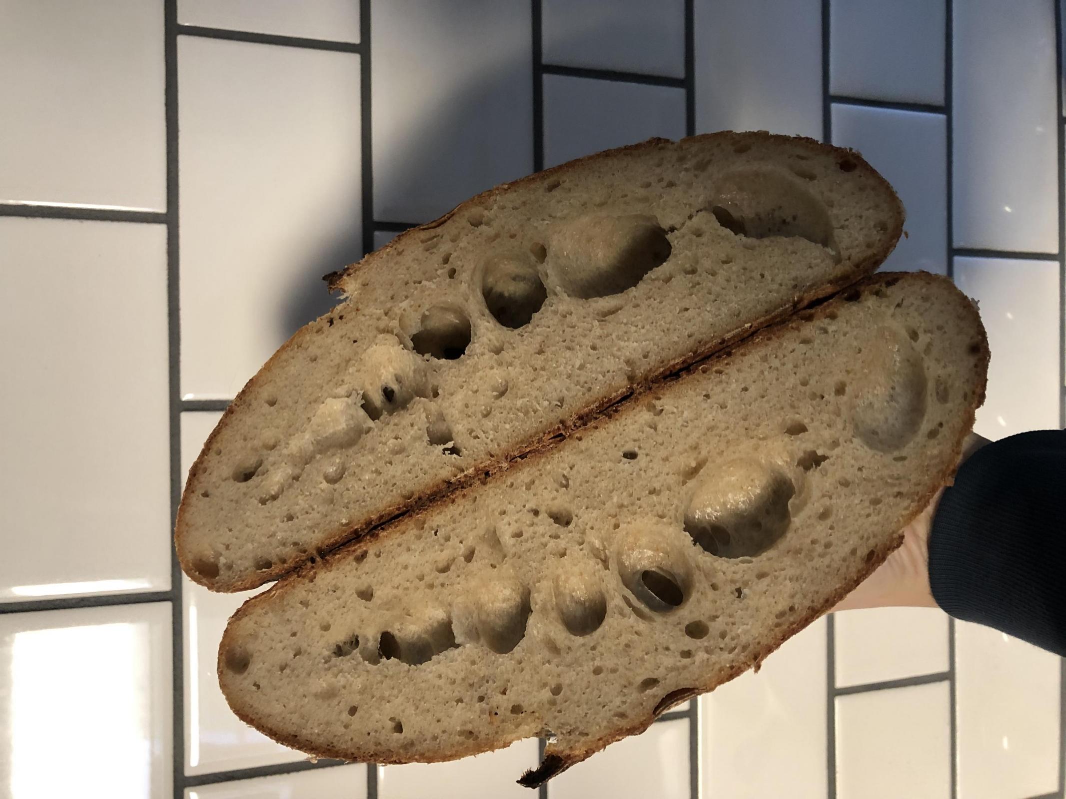 In case it was underproofed, I took the second loaf out and let it sit at room temperature (probably about 65° ambient) for around an hour. Baked around 11 AM (preheated at 500°, baked covered at 450° for 25 minutes, then finished uncovered). However, this loaf was also a total pancake with that weird crumb structure! It doesn't taste particularly sour, though. At this point I have no idea whether I'm under- or over-proofing and am losing my mind.