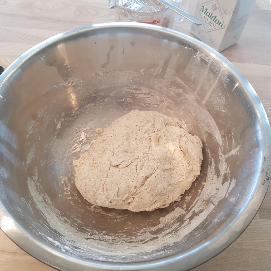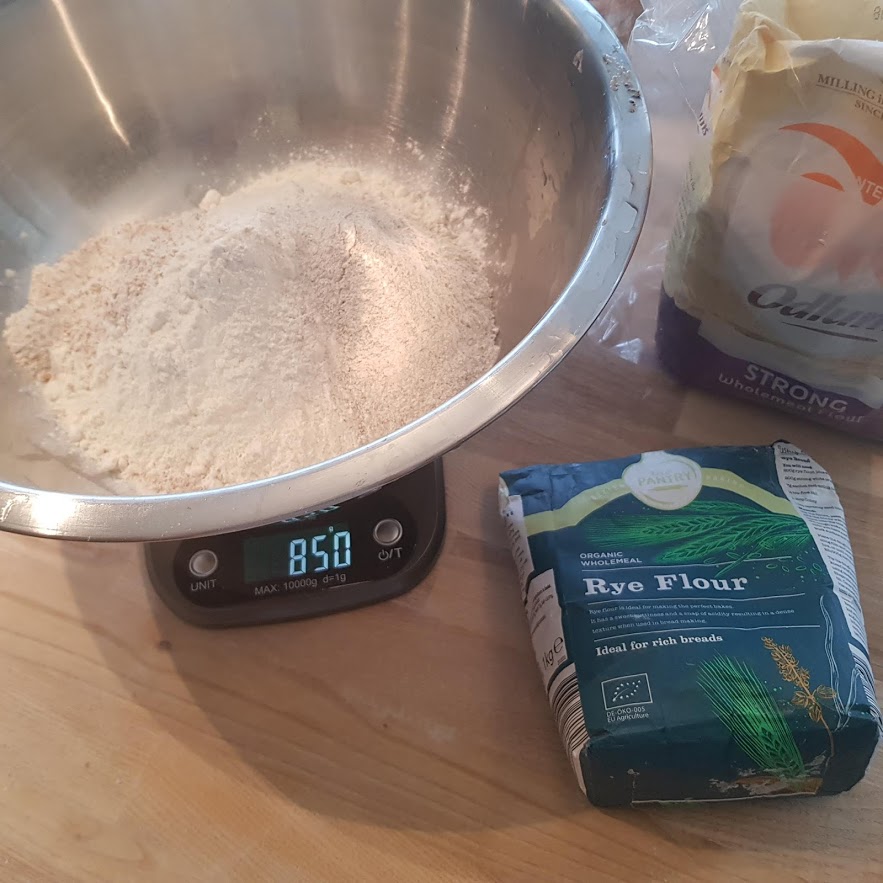 Started autolyse by mixing all the flour (white/ ww / rye) with 500g of water. It was dryer/firmer as i withheld the stout for the soaker.
