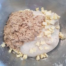 The 100g of cheddar was just a guess amount and i cubed it rather then grate as i wanted it to be found through the bread rather then incorporated/lost.